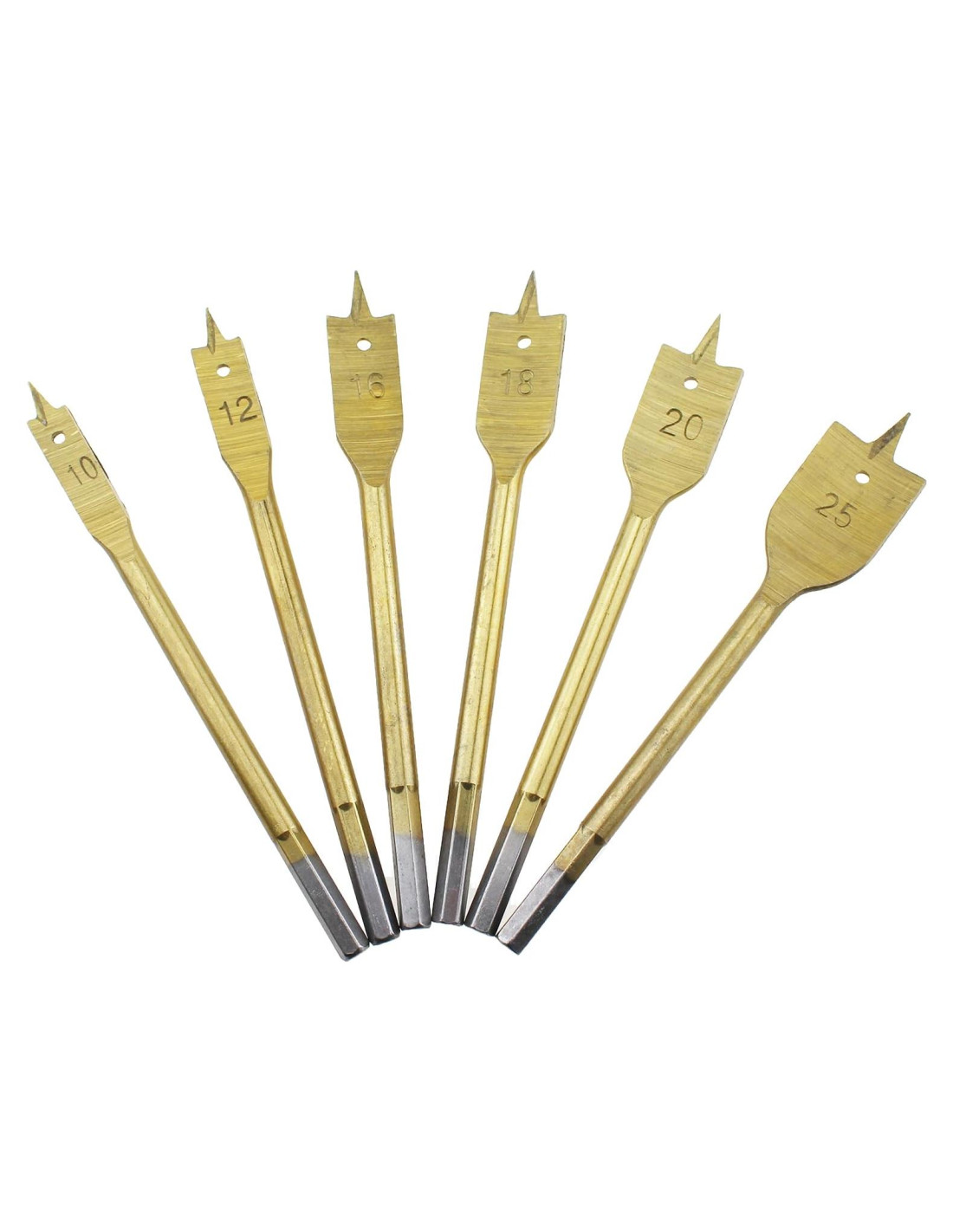 Material: acero al carbono de alta calidad Tamaño: 3/8 pulgadas (0,95 cm), 1/2 pulgadas (1,27 cm), 5/8 pulgadas (1,59 cm), 3/4 pulgadas (1,91 cm), 7/8 pulgadas (2,22 cm), 1 pulgada (2,54 cm) Especificación: juego de 6 piezas Fácil de usar: mango hexagonal de cambio rápido con ranuras para reducir el deslizamiento y prevenir el desalojo, seguro. Adecuado para la mayoría de los tipos de madera, así como metales blandos como fibra de vidrio, PVC (cloruro de polivinilo) y aluminio. Adecuado para vigas, unión, carpintería, fabricación de muebles y madera.