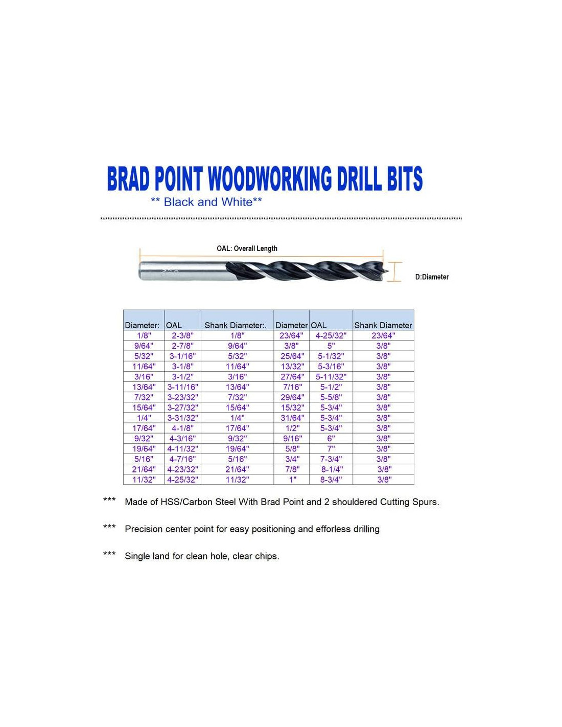 - Diseño de Punta Brad: Punta especial que se clava en la madera, previene que la broca se deslice o camine sin punzón de centrado. Ideal para usar con roble, arce, cerezo y otras maderas duras