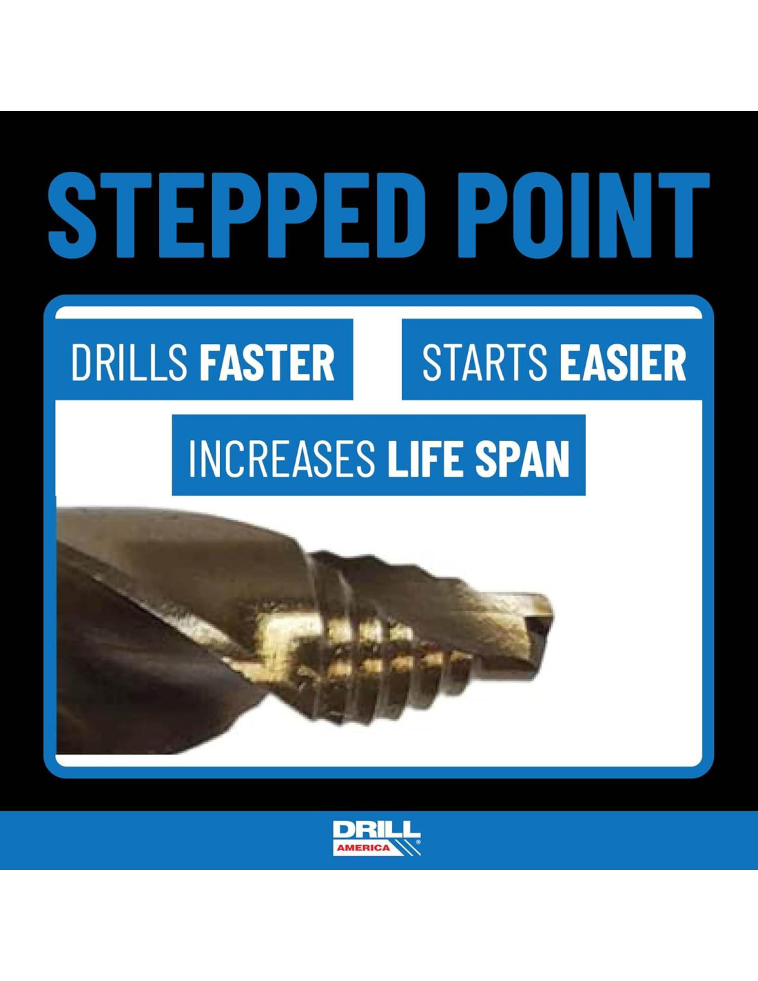 - PUNTA ESCALONADA DORADA DE COBALTO: Las brocas de cobalto de punta escalonada dorada de la serie GSC de Drill America comienzan más fácil, perforan más rápido, aumentan la vida útil y reducen el calor en comparación con las brocas estándar