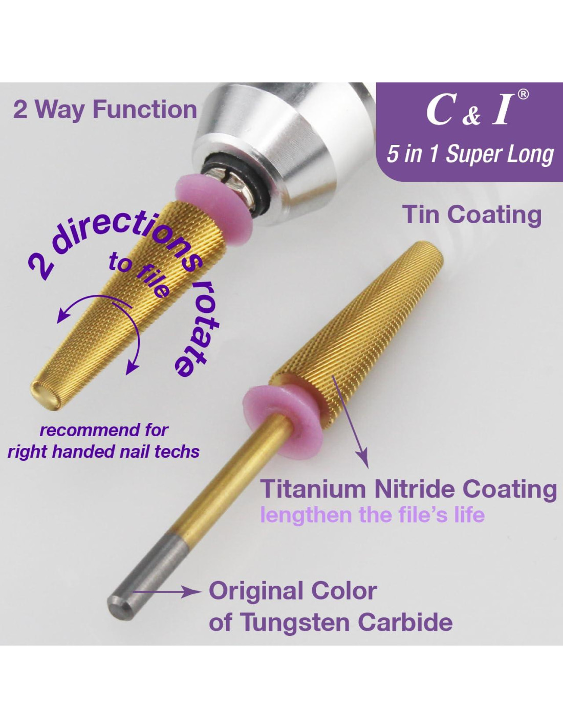 C&I Broca Profesional para Uñas Super Larga 5 en 1 Multifuncional Efile Versión Slim Diseño Especial para Uñas de Extensión, Uñas Falsas, Puntas de Uñas, Uñas Acrílicas, Gel Duro, Suministros de Polvo de Inmersión para Técnicos de Uñas Imprescindibles. Tamaños masivos de dientes de lima para elegir. Para geles acrílicos, geles UV, uñas acrílicas falsas u otros geles duros, se recomienda el tamaño 3XC, XXC, XC o C (Grueso). Para geles de uñas normales, el tamaño M o F podría ayudar. Para geles base, geles de permanencia, el tamaño XXF (Doble Fino). Y el tamaño XXF también podría usarse como pulidor de uñas para uñas naturales para hacer preparación o preparar uñas. Quitar Cutículas -Corte Redondeado: Una broca para cutículas, la esquina superior de la flauta cónica está diseñada para tener una esquina redondeada con dientes de lima. La broca de uñas está hecha de Carburo de Tungsteno. Recubrimiento de Nitruro de Titanio, ayuda a extender la vida de la lima de uñas. Vástago: 3/32" (2.35 mm), se adapta a la mayoría de las máquinas e file. Suministros profesionales para técnicos de uñas.
