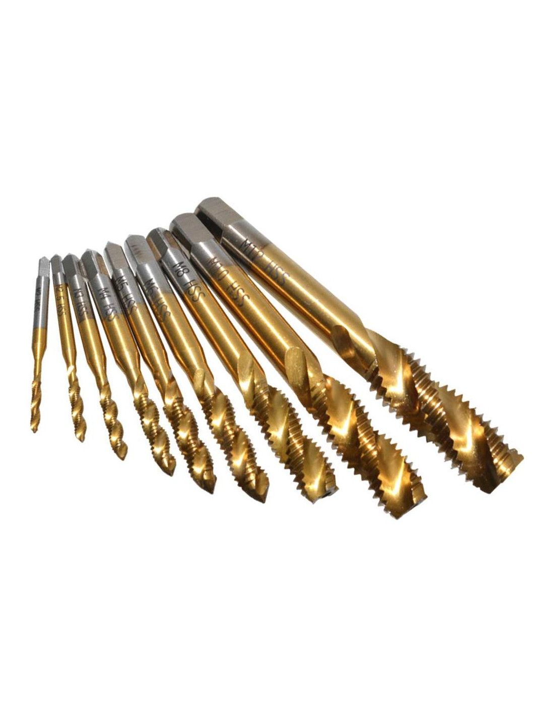 Yakamoz Juego de 9 Piezas de Brocas de Rosca de Titanio Recubiertas de HSS con Espiral Características: - Estas brocas están hechas de acero de alta velocidad 6542 y la superficie está recubierta con titanio para alta dureza y resistencia a la corrosión. - Hay un total de 9 piezas de brocas en diferentes tamaños desde M2 hasta M12 que puedes usar para roscar varios hilos. - Las brocas están diseñadas con flautas en espiral que son propicias para eliminar residuos, no se rompen fácilmente. - Se utilizan para cortar nuevos hilos o reparar hilos dañados, tendrás una experiencia de roscado suave con ellas. - Estas brocas HSS son excelentes herramientas utilizadas para crear hilos de tornillo, para cortar o formar la parte hembra del par acoplado. Especificación: Mango: Mango Redondo con Extremo Cuadrado Tamaño: M2*0.4, M2.5*0.45, M3*0.5, M4*0.7, M5*0.8, M6*1, M8*1.25, M10*1.5, M12*1.75 Material: HSS Tratamiento de superficie: Ti Paquete incluido: 9 x Brocas de Tornillo de Máquina