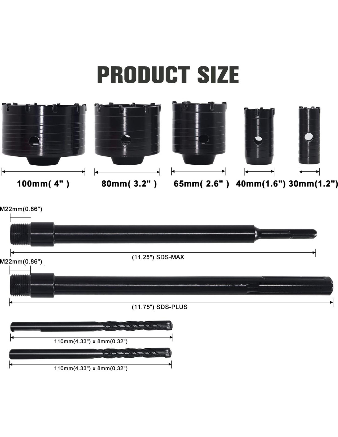 - KIT 5+2+2 - 5PCS Abridor de Agujeros: broca de masonería de 4" (100mm), 3.2" (80mm), 2.6" (65mm), 1.6" (40mm), 1.2" (30mm); 2PCS Varilla de Conexión SDS Plus Max: 11.25" (300mm), 11.25" (300mm); 2 PCS Broca Central: 4.33" x 0.32" (110mm x 8mm).