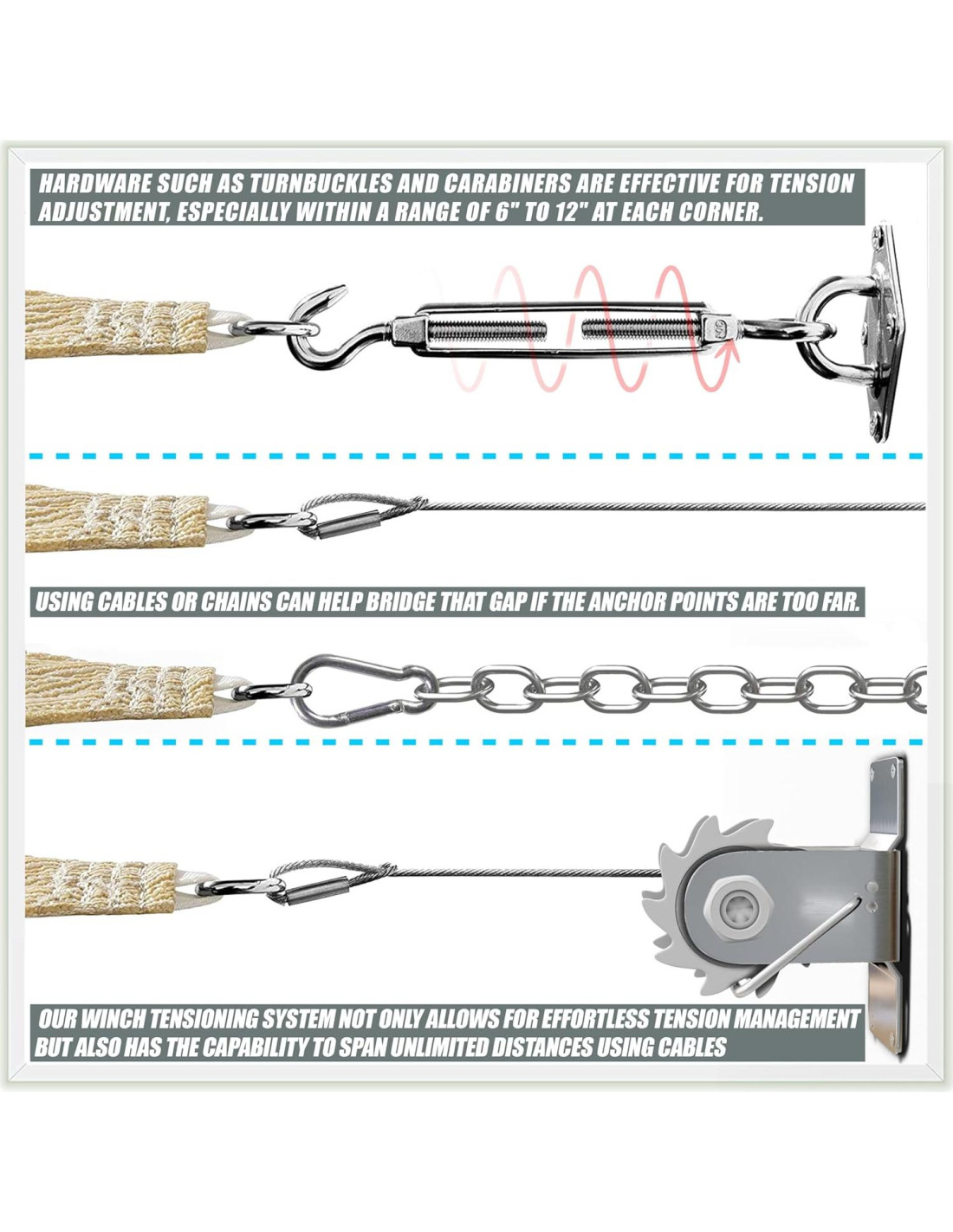 - Usos Amplios: con los kits de hardware adecuados, las velas de sombra se pueden fijar a casi cualquier estructura como postes, árboles, paredes, techos, etc. Aplicadas para el patio, carport, pérgola, tienda, piscina, jardín, incluso ventana.