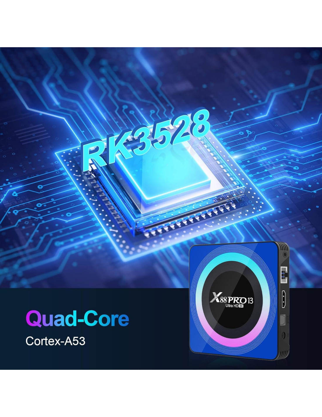 - [Android 13.0 OS & CPU Poderoso] Android TV Box equipada con el más nuevo sistema operativo Android 13.0, que es más rápido y eficiente que Android 11.0, más estable y fluido que Android 12.0. Un potente CPU RK3528 Quad-Core de ultra alta frecuencia asegura que la caja Android funcione sin problemas para cargar películas, imágenes y juegos sin buffering, proporciona un núcleo de salida potente y mejor compatibilidad de APP para la caja Android, así como una mejor experiencia de usuario.