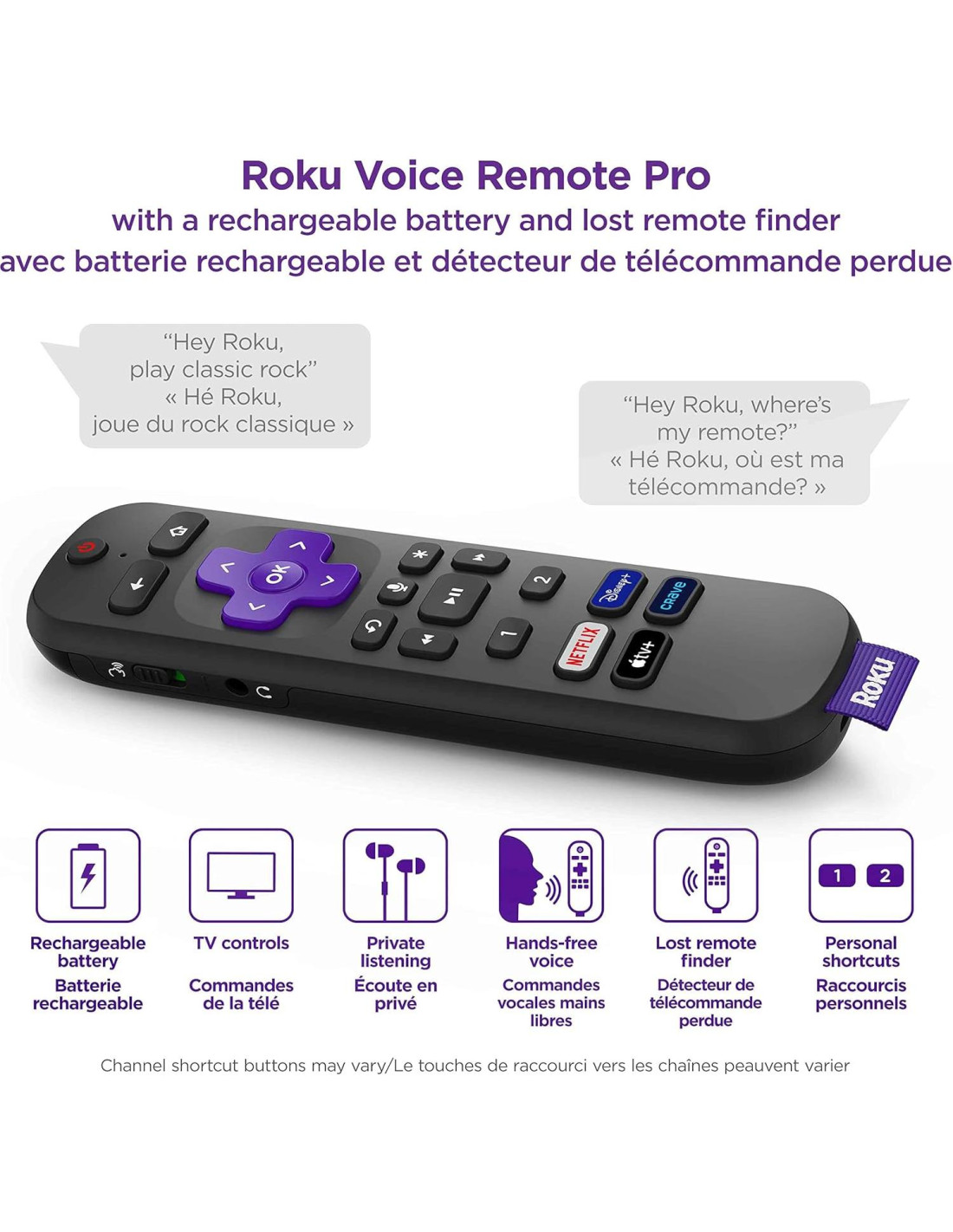- Usa tu voz para establecer accesos directos personales para control de un toque, buscar a través de canales, activar subtítulos y más con el control remoto de voz mejorado; disfruta de escucha privada con los auriculares JBL Premium incluidos y controles de TV; convierte tu dispositivo iOS o Android en el compañero definitivo; controla tu reproductor de medios Roku o Roku TV, usa búsqueda por voz, disfruta de escucha privada y más en iOS y Android