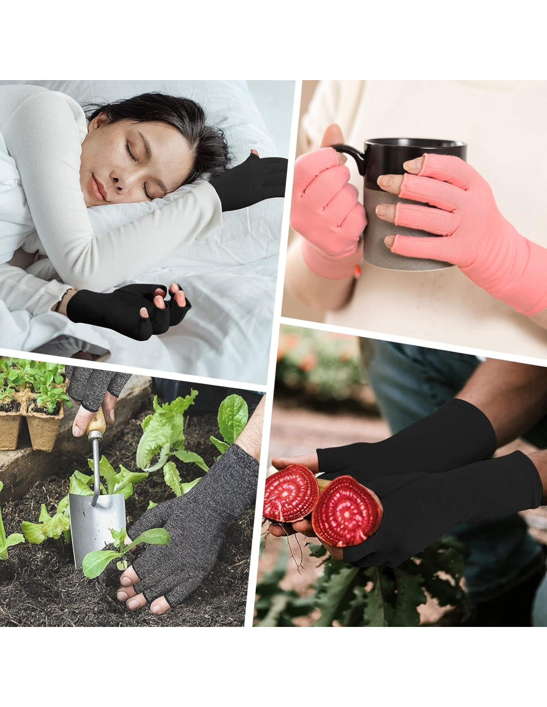 - DISEÑO SIN DEDOS - Guantes de artritis para hombres y mujeres. Con el diseño de dedos abiertos, permite al usuario realizar perfectamente tareas diarias como: escribir, usar teléfonos celulares, cocinar, conducir, etc. La longitud de la funda del pulgar está establecida en la longitud óptima para permitir el equilibrio más adecuado entre el soporte de compresión efectivo y el movimiento de los dedos.