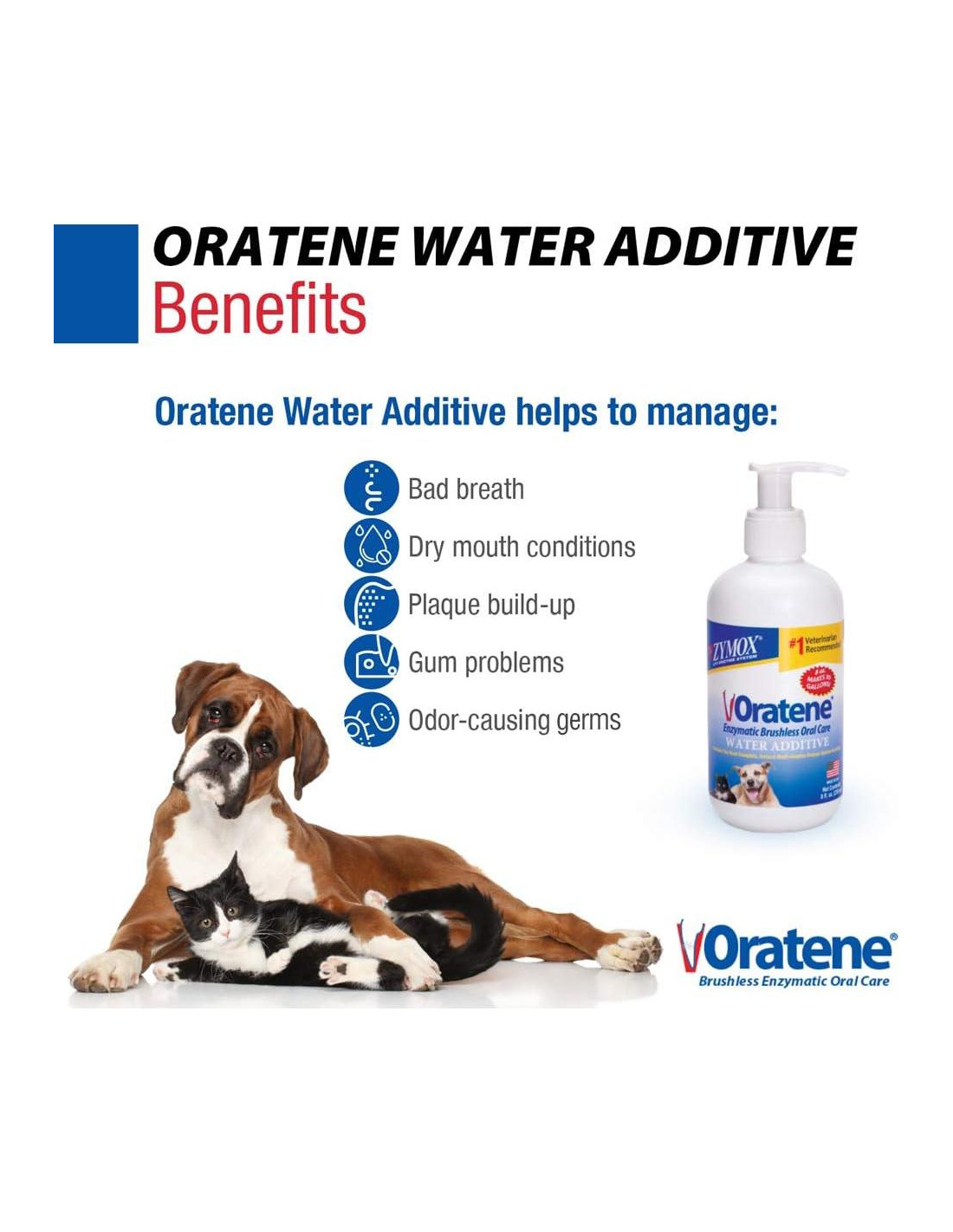 El Aditivo de Agua ZYMOX Oratene es una respuesta simple y rápida para el cuidado oral de gatos y perros. Sin necesidad de cepillado, este ambientador de aliento para gatos y perros se puede agregar simplemente al agua de beber de su mascota cada día para ayudar a mantener su boca saludable y su aliento fresco.