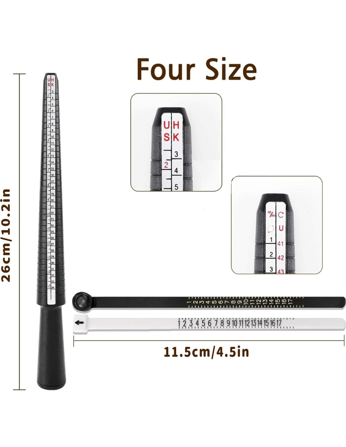 - Kit de Tallas de 7 Piezas Completo para Precisión: Incluye 1 varilla de tamaño ajustable, 2 anillos de tamaño codificados por colores (28 tamaños cada uno en negro + blanco), 3 cintas flexibles para dedos (US 1-17), y 1 tarjeta de tamaño de papel. Perfecto para medir con precisión las tallas de anillo en casa o profesionalmente.