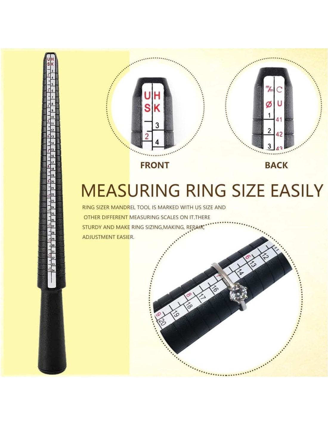 - El kit de medición y reparación de tallas de anillos contiene un mandril de talla de anillo que puede medir la talla de anillo en casa. El mandril de talla de anillo es preciso y tiene diferentes escalas de medición en él. Los medidores de anillos que puedes deslizar directamente en tus dedos para determinar la talla. El medidor de anillos y el medidor de talla de anillos han sido útiles al ordenar anillos en línea.