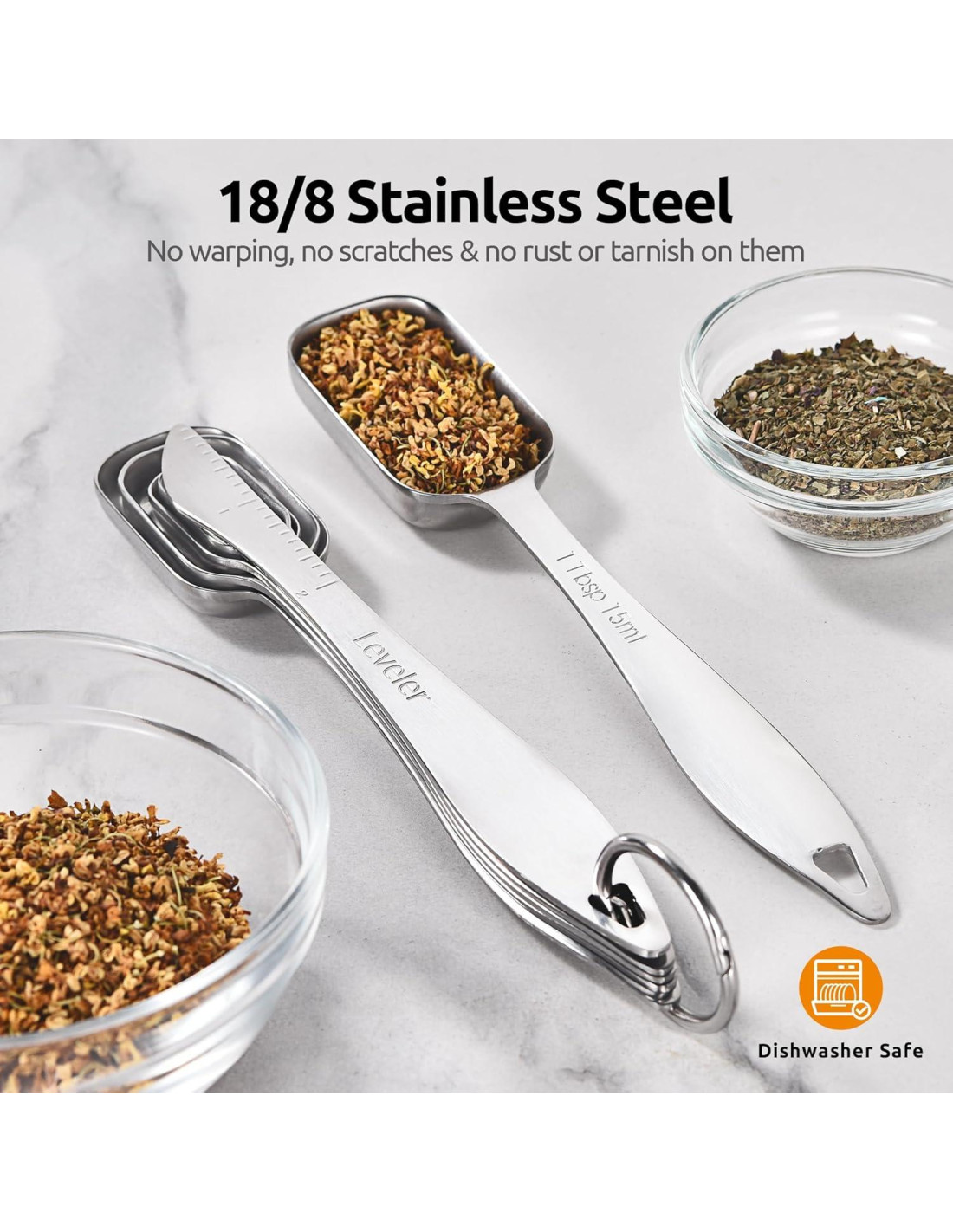 - ¿Necesitas cucharas medidoras duraderas que no se oxiden? Este juego de cucharas medidoras de acero inoxidable está fabricado con acero inoxidable 18/8 de alta calidad, asegurando que no se deformen, rayen, oxiden o empañen, incluso después de un uso repetido en tu cocina. Estas cucharas medidoras de metal están diseñadas para soportar las tareas más difíciles de la cocina, convirtiéndolas en una adición duradera a tu rutina de horneado y cocina. ¡Di adiós a las cucharas endebles que se degradan con el tiempo!