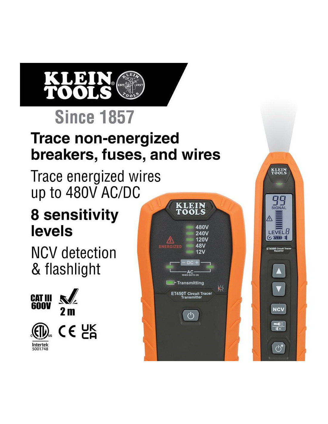 El Kit de Trazador de Circuito Avanzado Klein Tools ET450 es un trazador profesional para interruptores, fusibles y cables energizados y no energizados. Cuando el Transmisor está conectado a un circuito, la sensibilidad del Receptor se puede ajustar fácilmente para detectar la señal transmitida en interruptores, fusibles y cables a través de paneles de yeso, bloques de cemento y subterráneo. El kit incluye transmisor, receptor, cuchilla y pines de tierra, clips de cocodrilo, adaptadores de cable de 3 pies (0.91 metros) y 20 pies (6.1 metros), cables de enchufe de CA, instrucciones, todas las baterías requeridas y un estuche rígido con asa para un transporte y almacenamiento convenientes.