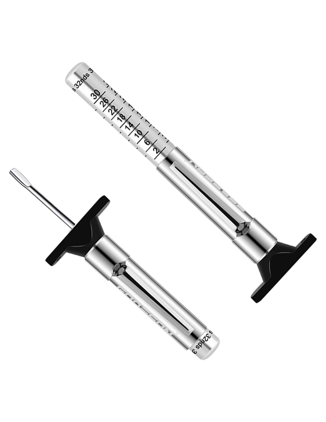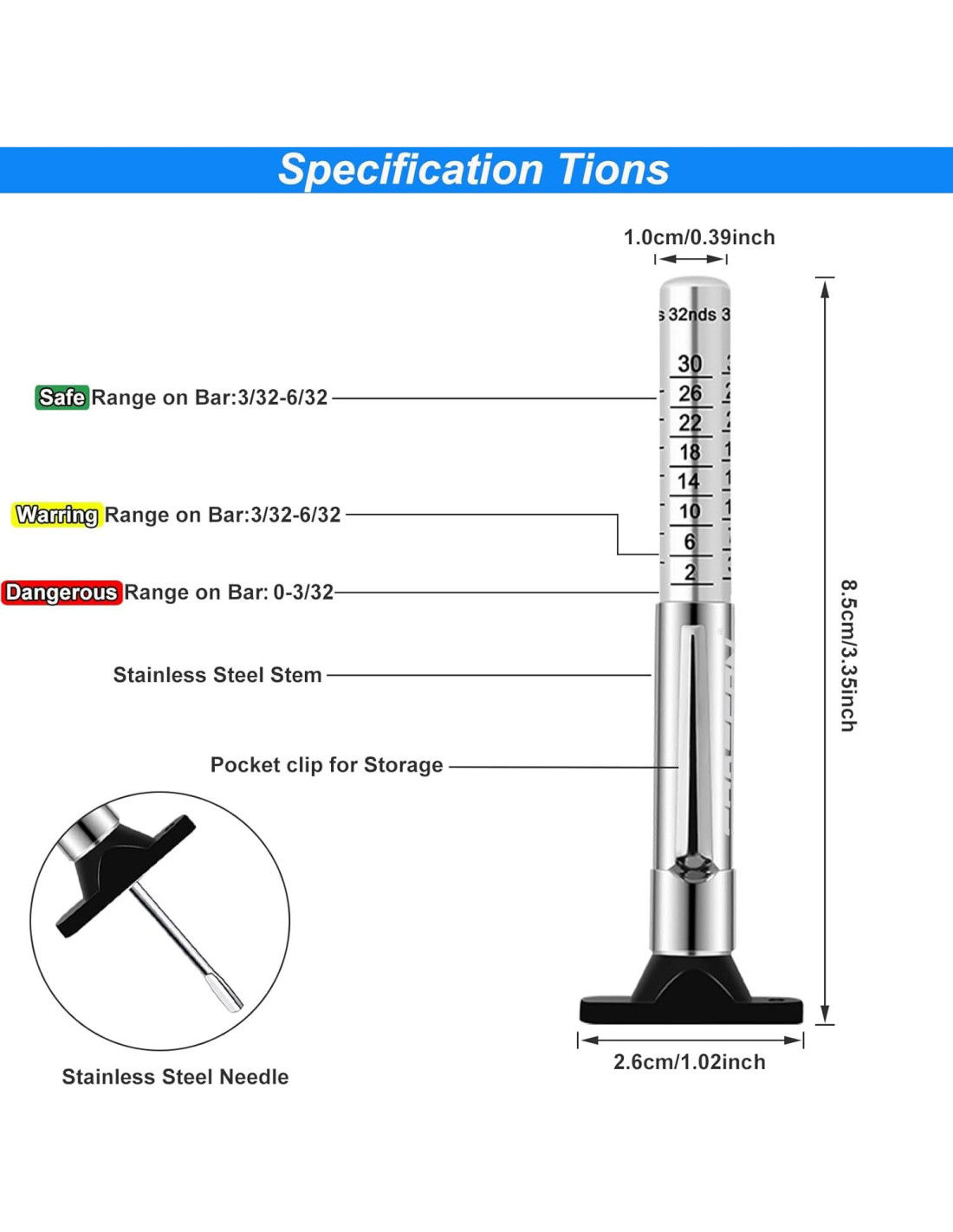 - 1. Precisión y Durabilidad: El medidor de profundidad de banda de rodadura de metal cuenta con un cuerpo de acero inoxidable con un acabado cromado y marcas grabadas con láser en impresión negra, asegurando mediciones precisas y claras que son resistentes al desgaste. Es duradero, de larga duración y diseñado para soportar un uso intensivo.