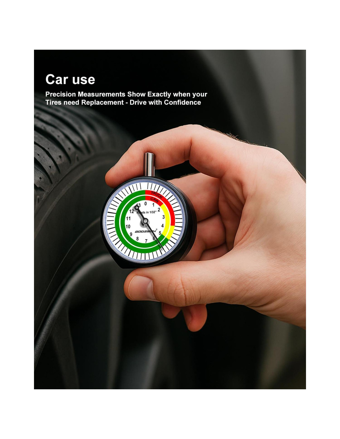 - 1. Medición Precisa: Este medidor de profundidad de banda de rodadura de neumáticos cuenta con un diseño de dial, mide con precisión en incrementos de 1/32 pulgadas (0.79 mm), asegurando que puedas monitorear fácilmente y con confianza la condición de los neumáticos para una seguridad y rendimiento óptimos de tus coches y camiones.
