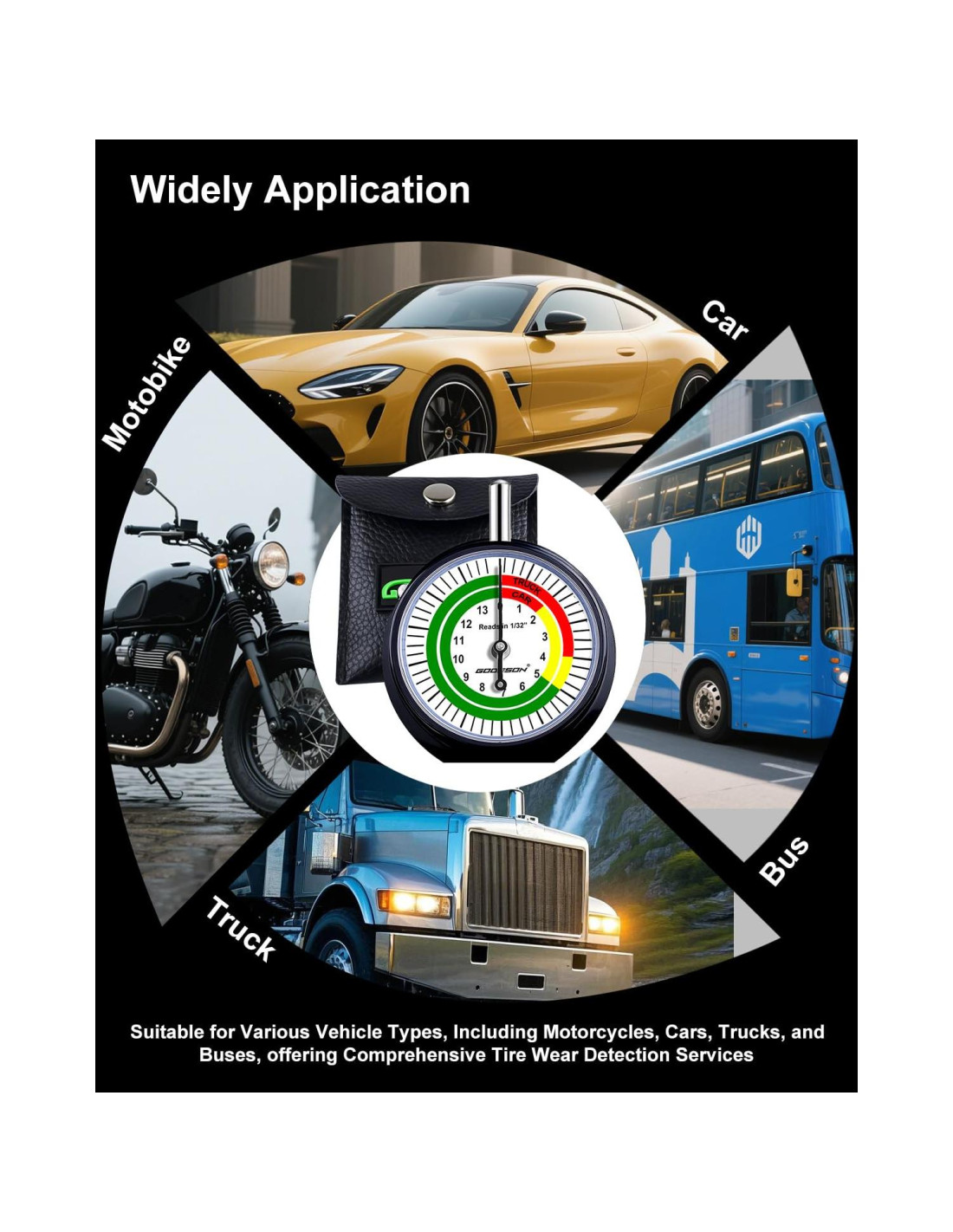 - 2. Compatibilidad Dual de Vehículos: Este medidor de profundidad de banda de rodadura tipo dial funciona sin problemas con coches de pasajeros y camiones, lo que lo convierte en una herramienta versátil para casi todas tus necesidades de mantenimiento de neumáticos.