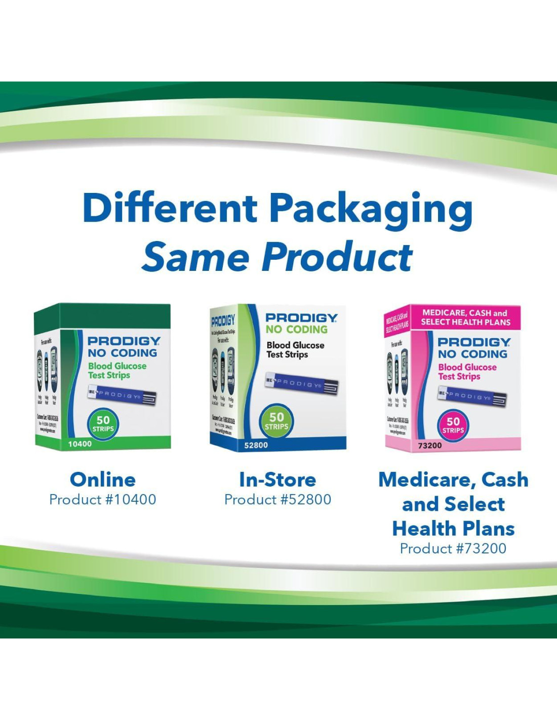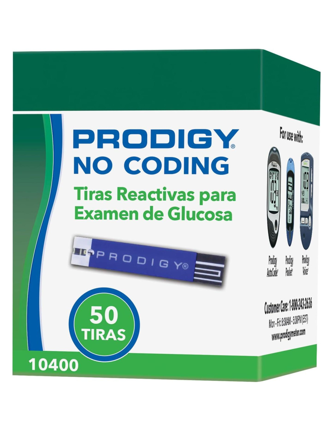 - Tiras de Prueba de Glucosa en Sangre PRODIGY Sin Codificación de Confianza, Caja de 50 Tiras, ahora en empaque verde para pedidos en línea; mismo producto confiable (52800 y 73200) que conoces y en el que confías. Ver imagen número 2 para ver el empaque familiar al que estás acostumbrado.