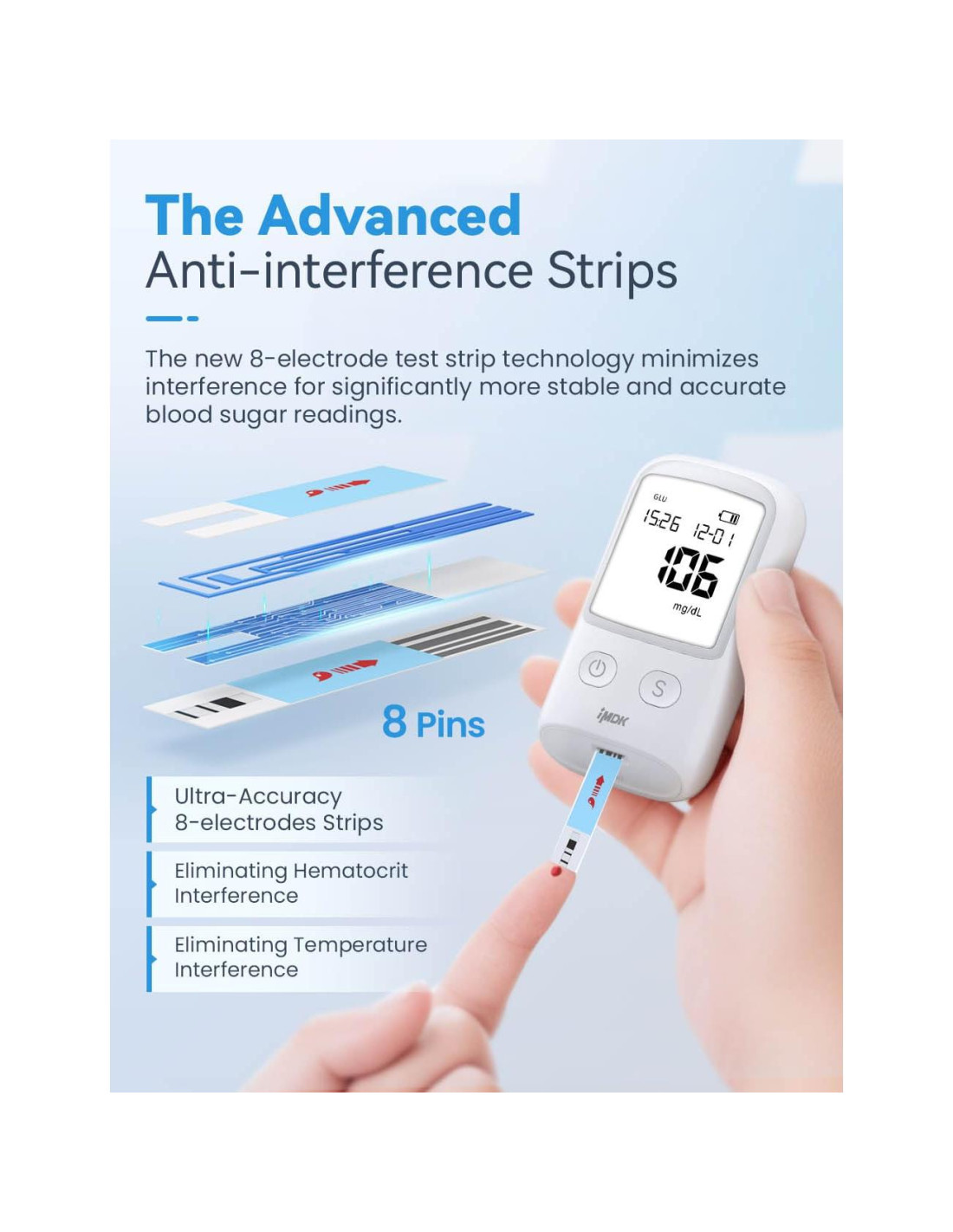- Tecnología Avanzada de 8 Electrodos: Reduce la interferencia de sustancias comunes como maltosa, galactosa, xilosa y minimiza el impacto de la temperatura y la humedad para una precisión excepcional. Solo requiere 5 microlitros de sangre para entregar resultados precisos en 5 segundos. Te sentirás más seguro con cada resultado de prueba.