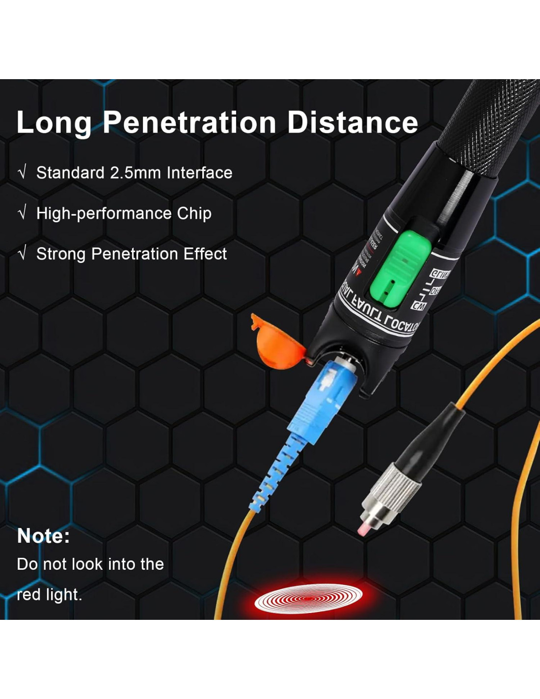 - Puede detectar y localizar fácilmente y con precisión rupturas de fibra, malas conexiones, doblados o grietas. El detector emitirá una luz roja brillante de 650nm para el rastreo de fibra, las rupturas o fallas en la fibra refractarán la luz, creando un brillo brillante alrededor del área defectuosa.