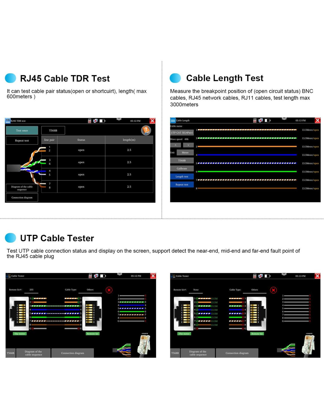 - [ Probador de Cable RJ45 y Herramientas de Prueba de Red ] Prueba TDR de CABLE RJ45: puede probar el estado del par de cables (abierto o cortocircuito), longitud (máx. 600 metros); Probador de Cable UTP: prueba el estado de conexión del cable UTP y lo muestra en la pantalla, soporta detectar el punto de falla de cerca, medio y lejos del conector RJ45; Prueba de Longitud de Cable: Mide la posición del punto de ruptura (estado de circuito abierto) de cables BNC, cables de red RJ45, cables RJ11, prueba de longitud máx. 3000 metros. Prueba de Red: escaneo de dirección IP, prueba PING, LLDP, PPPOE, gestión de archivos FTP, etc.