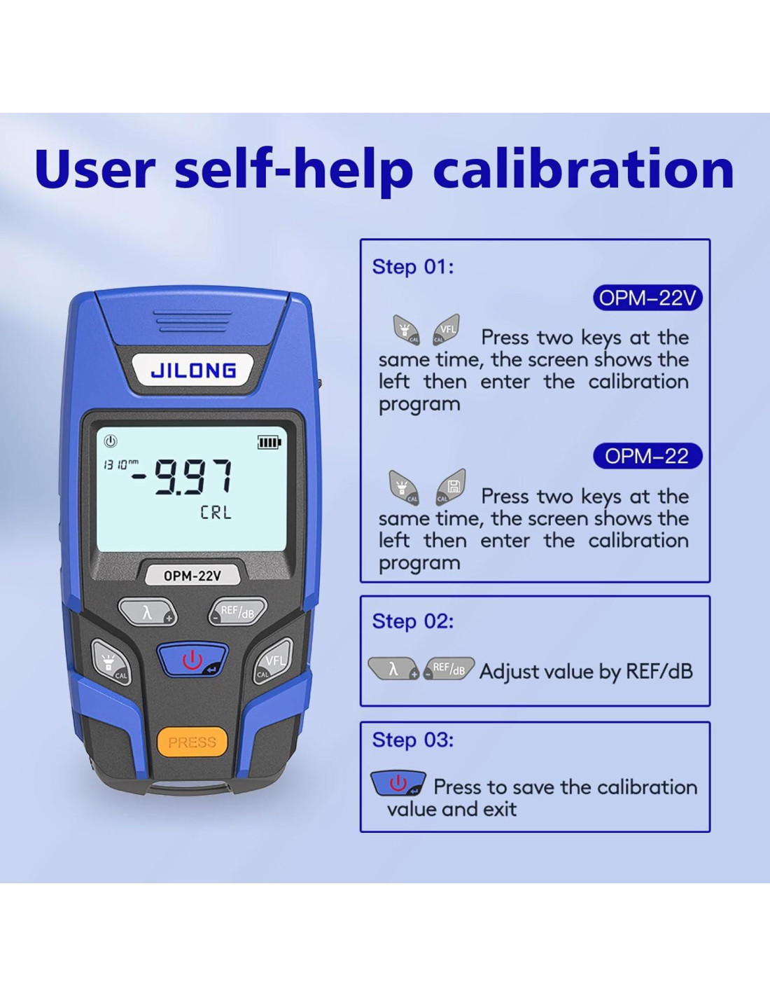 - JILONG OPM FTTH Probador de Pérdida Mini Medidor de Potencia Óptica (-50~+26dB) OPM-22V Integrado VFL Localizador de Fallas Visuales+Interfaz RJ45+Rango de Medición 800-1700nm+Luz LED+Auto Calibración
