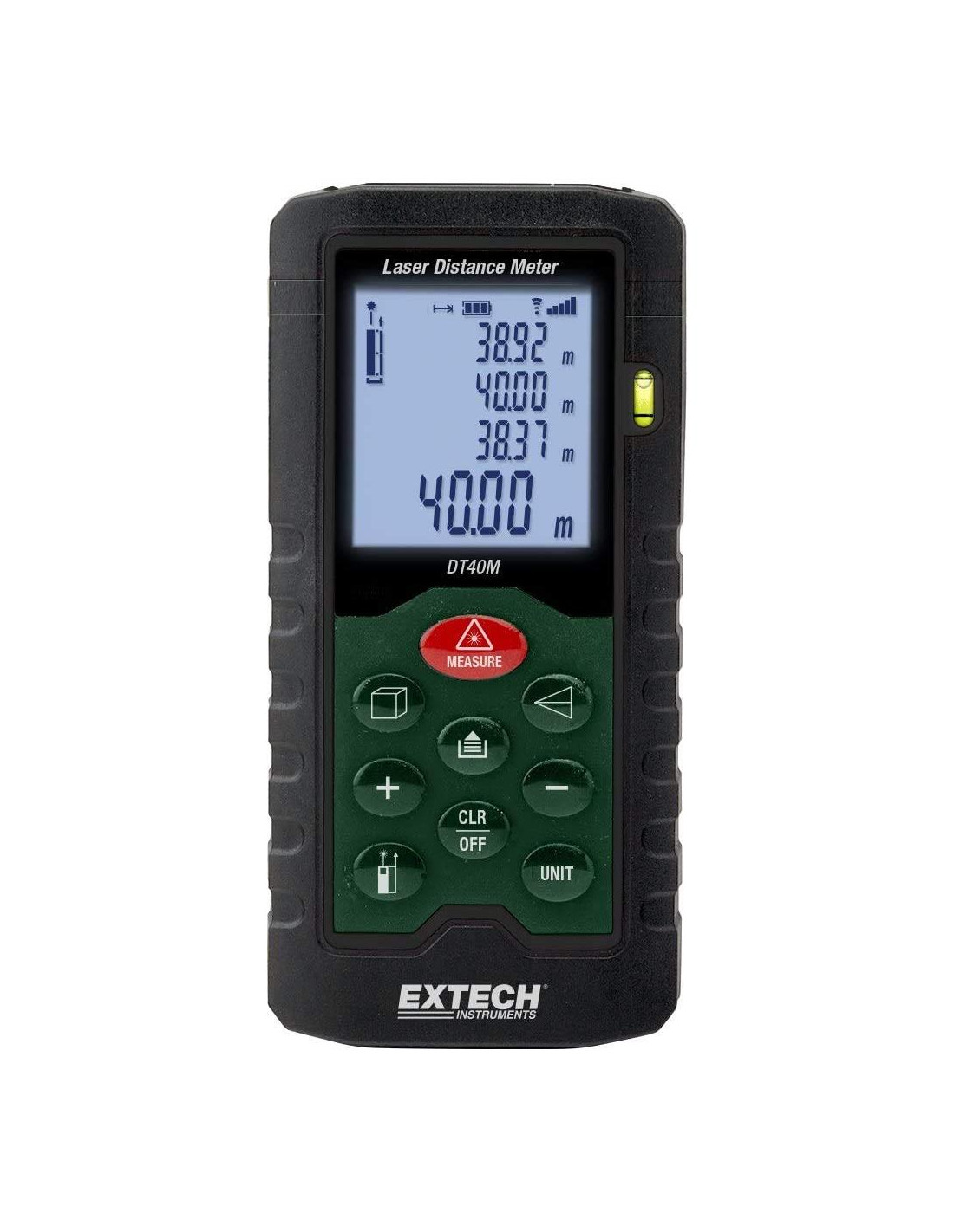 El DT40M de Extech mide distancias de hasta 131ft (40m). Puede calcular área y volumen y el Teorema de Pitágoras integrado permite al usuario realizar mediciones indirectas. Otras características incluyen medición continua con seguimiento de distancia Mínima/Máxima, memoria de 20 puntos, suma/resta de lecturas secuenciales, referencia de borde frontal o trasero, y una función de Stakeout. Gran pantalla LCD retroiluminada cuádruple y carcasa moldeada doble. También cuenta con un nivel de burbuja incorporado y viene con una correa para la muñeca y baterías.