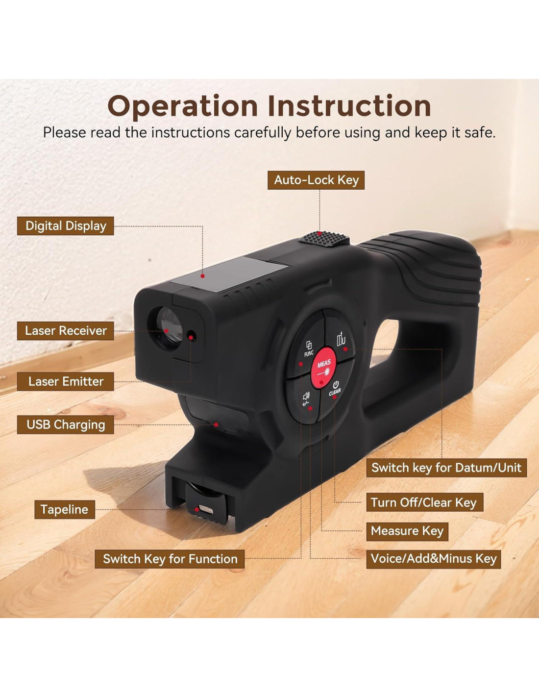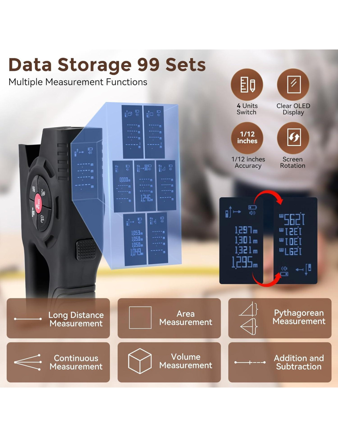 - Herramienta de Medición Láser 3-en-1: Nuestra herramienta de medición combina una cinta métrica de doble cara de 16ft con un medidor láser de 393ft, equipado con láser Clase II (620-690nm) para mediciones precisas de +/-1/12 pulgadas (+/-2,54 mm).