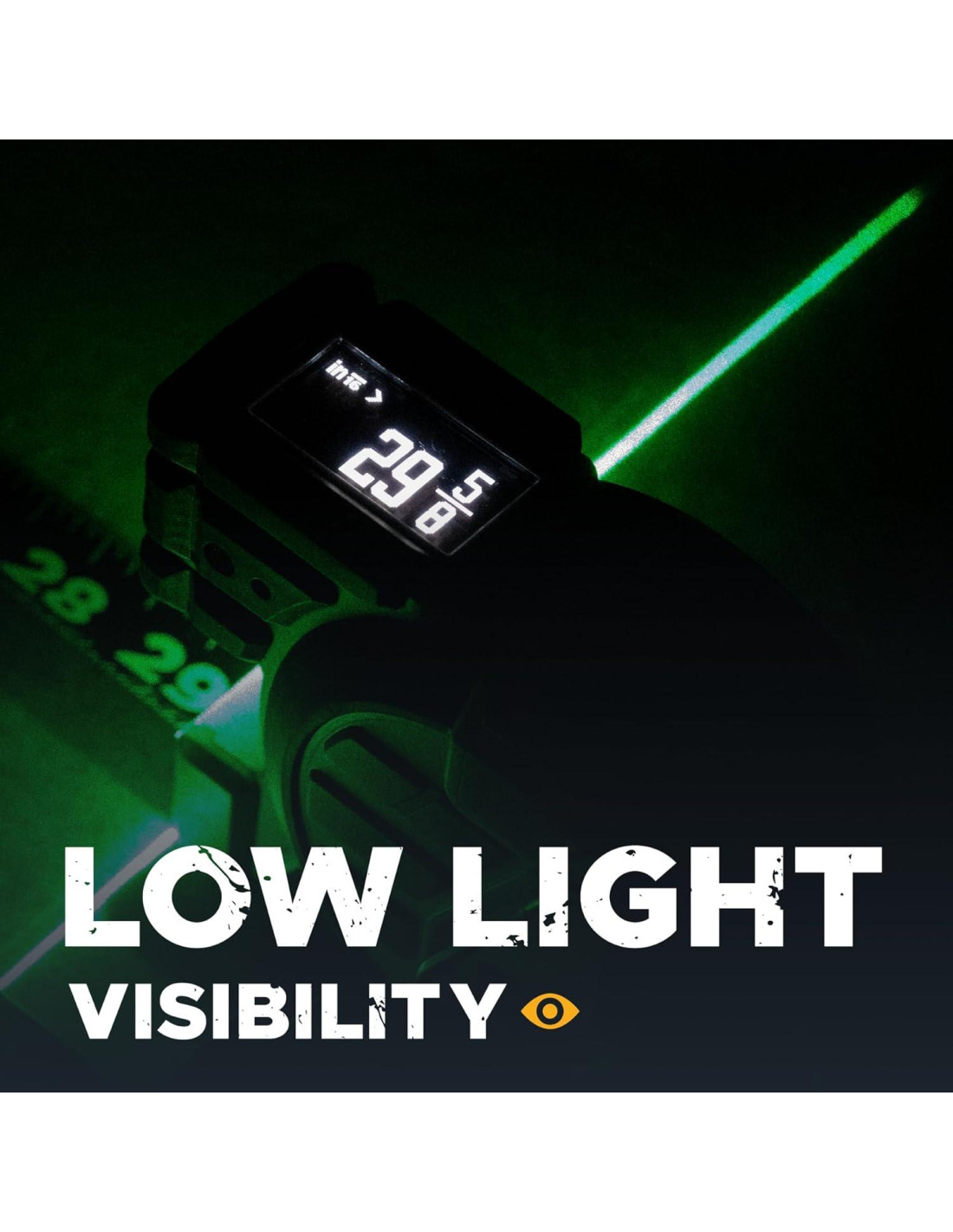 - GUÍA LÁSER - Un láser verde de ancho fino integrado proyecta y se extiende desde la superficie de referencia frontal, ampliando la capacidad de alinear y marcar. Láser de Clase 2 con potencia <1mW.