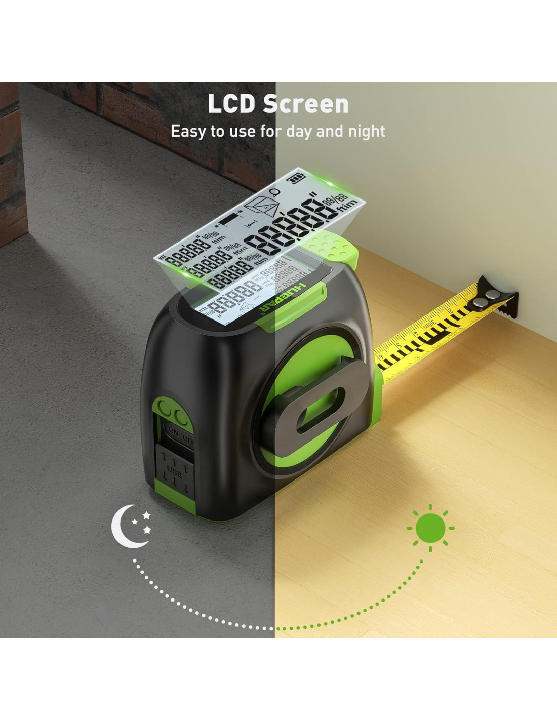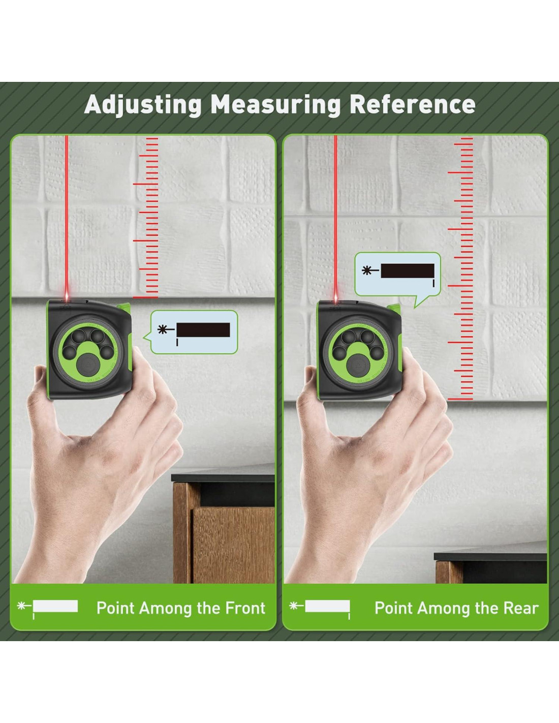 - [Cinta Láser de Fácil Operación] La cinta métrica láser digital tiene escalas métricas e imperiales en la cinta para una fácil lectura. El gancho móvil mejora la precisión para la medición de interiores y exteriores. El freno de bloqueo ayuda a controlar la velocidad de reciclaje de la cinta para una medición segura. La pantalla LCD retroiluminada mejora la legibilidad en condiciones de poca luz. El valor de medición se mostrará en tiempo real al medir una sola distancia en modo de cinta métrica.