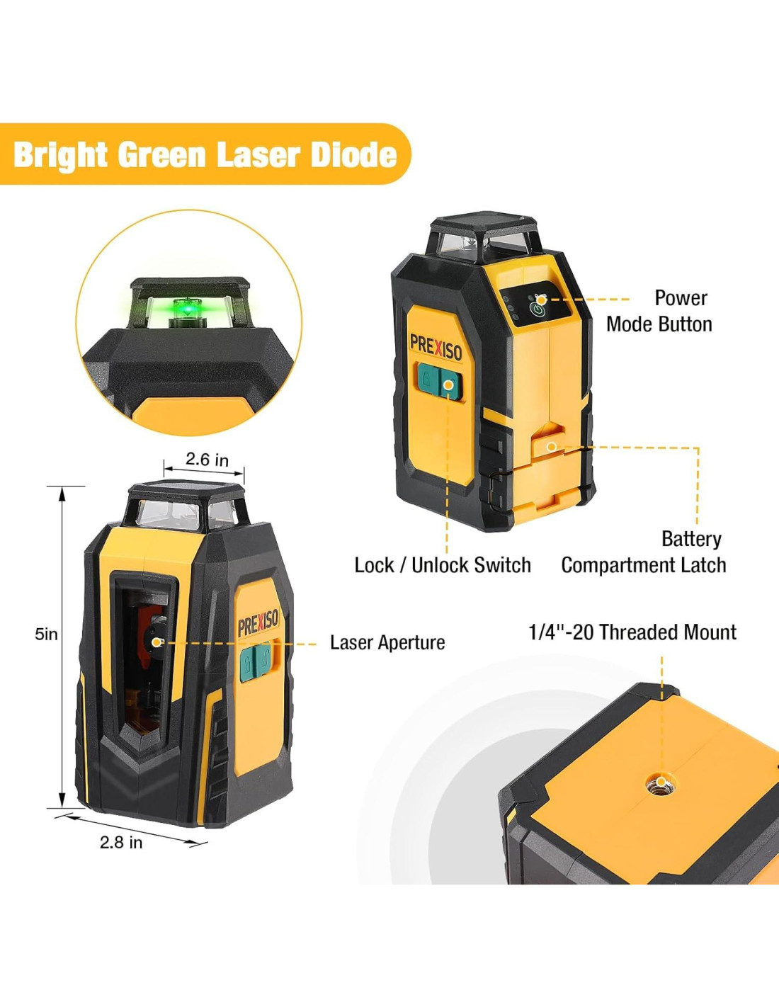 - Nivel Láser 360 PREXISO con Trípode - Fuente de láser verde 360 y 3 Modos de Proyección: el haz horizontal de 360 proyecta fácilmente una línea que cubre la pared, el techo. Proyecta líneas horizontales, verticales y cruzadas brillantes sobre superficies planas, 3 modos de línea láser pueden ser cambiados independientemente; El láser verde es 3 veces más brillante que el láser rojo con la misma fuente de luz, y le da un brillo máximo de láser verde de hasta 100 ft (30.48m) con alta precisión