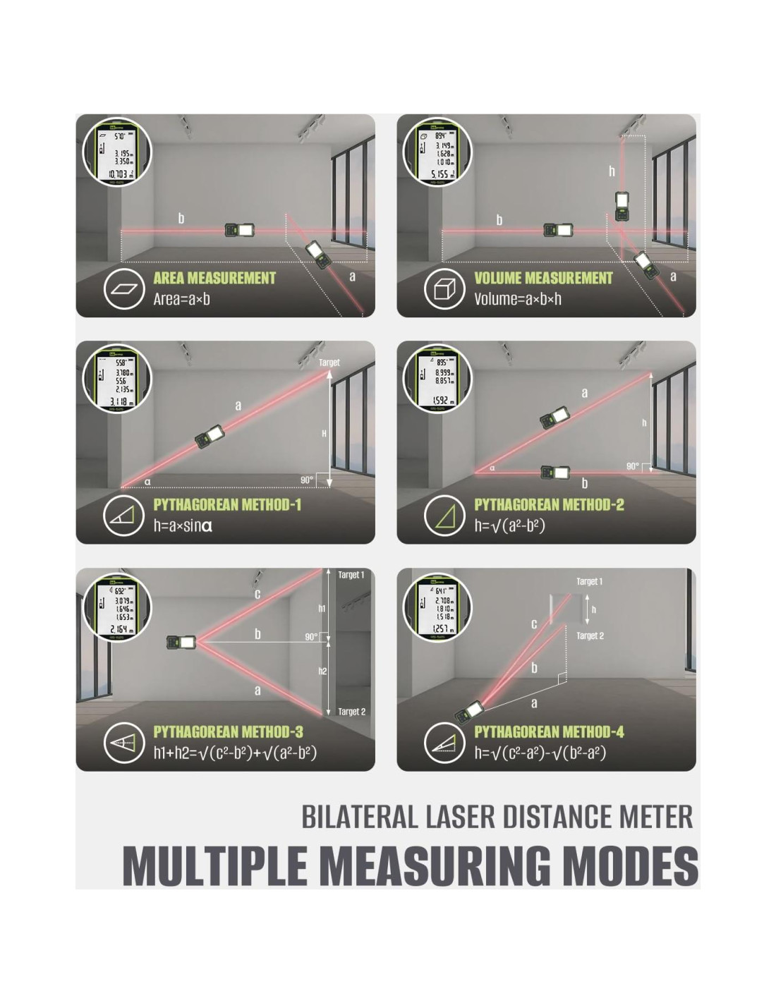 - Múltiples Modos de Medición: El medidor de distancia láser ofrece una variedad de modos de medición que incluyen medición continua; cálculos de área y volumen; teorema de Pitágoras para altura/ancho indirecto; y medición de ángulo. Puedes cambiar fácilmente entre modos de láser bilateral y simple, satisfaciendo las necesidades tanto de mediciones de longitud simples como de cálculos de volumen complejos