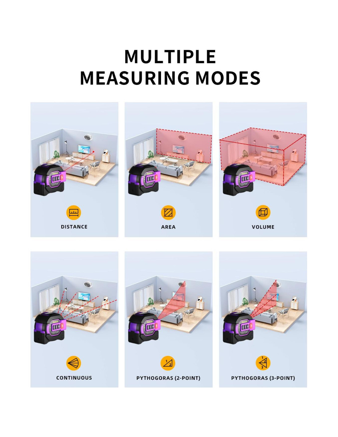 - 6 Modos de Medición Láser: Esta cinta métrica digital ofrece 6 modos de medición: Distancia, Continua, Área, Volumen, Pitágoras (2 puntos y 3 puntos). Cambia sin esfuerzo entre 4 unidades (m/ft/in/ft+in) y voltea referencias frontal/traseira al instante. Láser de Clase II (<1mW) asegura operación segura en todas las aplicaciones profesionales y personales.