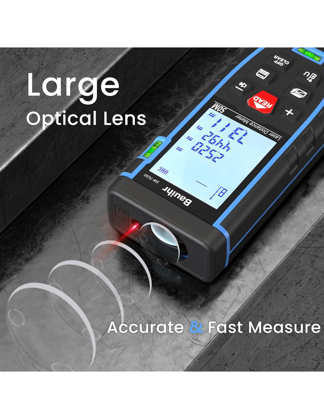 - Rápido y Preciso: Cuenta con láser de Clase II con extrema precisión dentro de +/-1/16 pulgadas (+/-1.59 mm) y hasta 50m de distancia de medición. Equipado con lente óptica curva de PC para asegurar un tiempo de respuesta rápido en 0.5s. (SALIDA MÁX.<1mW)