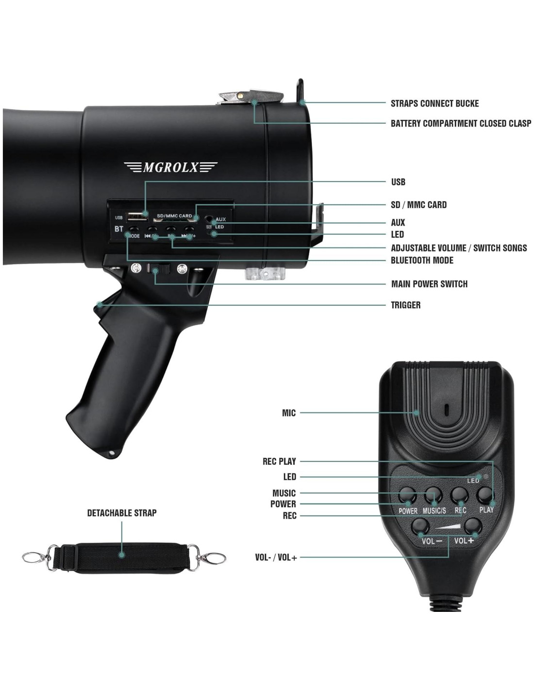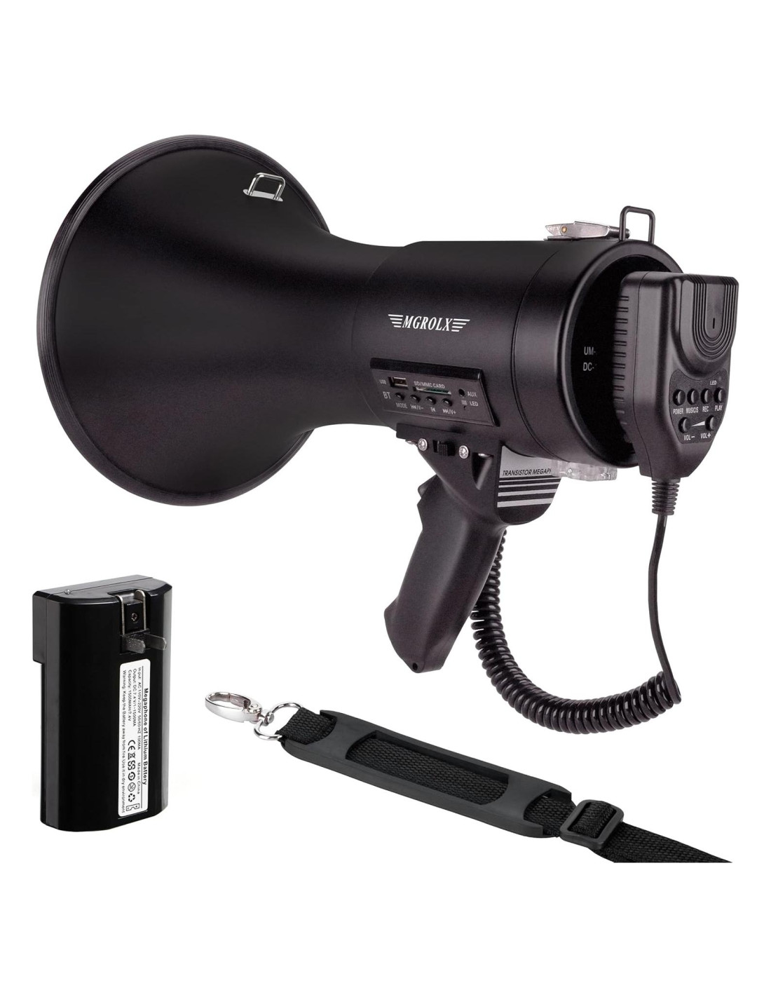 Megáfono profesional MGROLX de 50 vatios, proceso de lijado especial crea una textura inigualable. Además de amplificar el sonido, el altavoz de megáfono también puede leer el archivo de audio en tu tarjeta USB/SD y reproducirlo para la multitud. También puedes conectar tu teléfono, MP3 u otro dispositivo de forma inalámbrica o por cable a través de tecnología Bluetooth o línea auxiliar para transmitir datos de audio al megáfono y amplificarlos a través del sistema PA. El megáfono también tiene funciones de sirena y grabación para satisfacer tus diversas necesidades. Lo que puedes obtener: megáfono de 50w, batería recargable y correa desmontable.