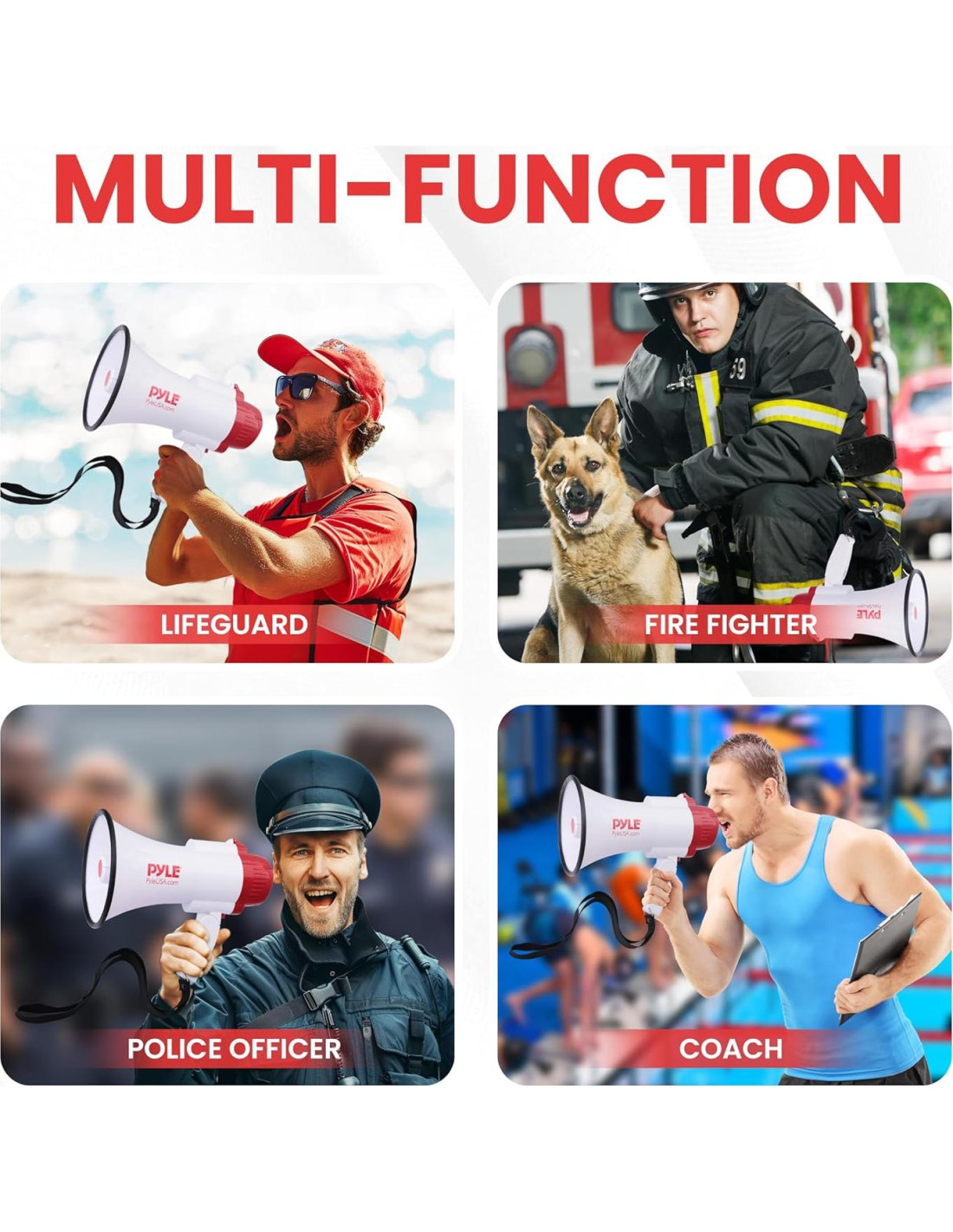 - MODOS DE AUDIO INCORPORADOS: Incluye charla de voz, alerta de sirena y grabación/reproducción de 10 segundos. Ya sea que necesites una opción de megáfono recargable o un altavoz para anuncios, es ideal para eventos, simulacros, animación y respuesta a emergencias.