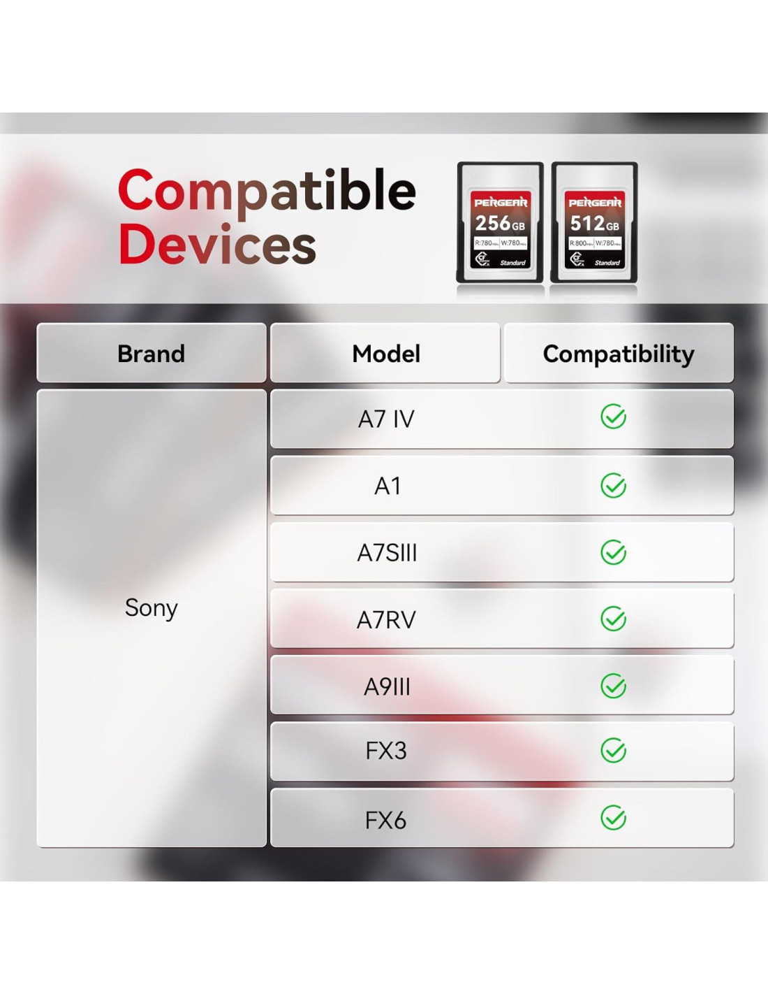 - Compatible con Cámaras Sony Alpha y FX: La tarjeta CFexpress Tipo A de 256GB de Pergear ha sido aprobada para las cámaras Sony A7 IV, A1, A7SIII, A7RV, FX3, FX6, A9III.