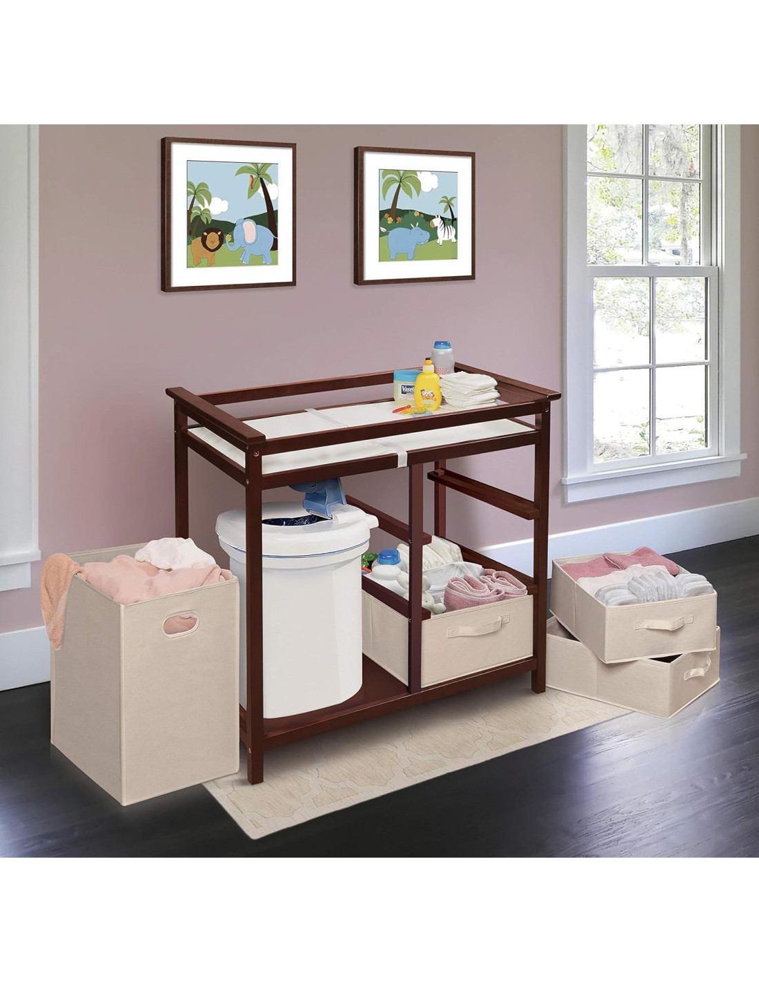 - AMPLIAS SOLUCIONES DE ALMACENAMIENTO: Cuenta con un gran cesto para ropa o almacenamiento, además de tres cestas para organizar pañales, toallitas, mantas y más, manteniendo los esenciales al alcance