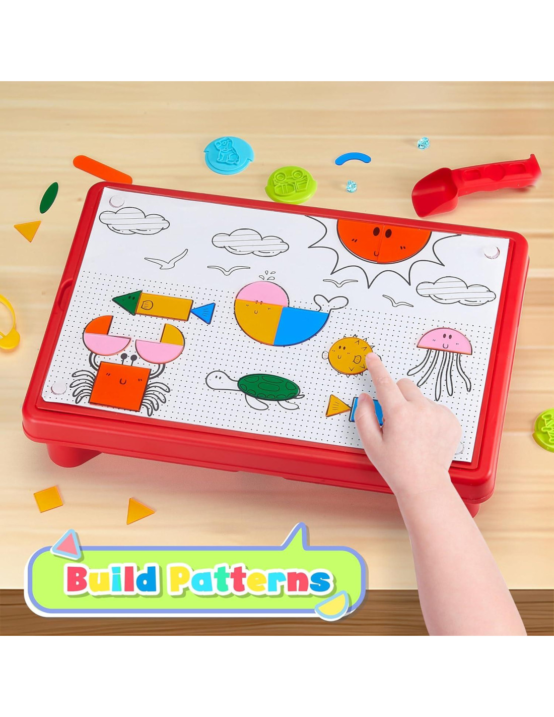 - Componentes incluidos: Mesa (43.2x29.2x25.9 cm), patas removibles, arena sensorial rosa, azul y amarilla, 39 bloques de rompecabezas de patrón translúcido, 2 herramientas de arena, 3 kits de cortadores de arena, 1 pinza, 9 moldes de estampado de arena con patrones y mangos, 4 papeles impresos, 1 hoja de PET clara, 12 gemas