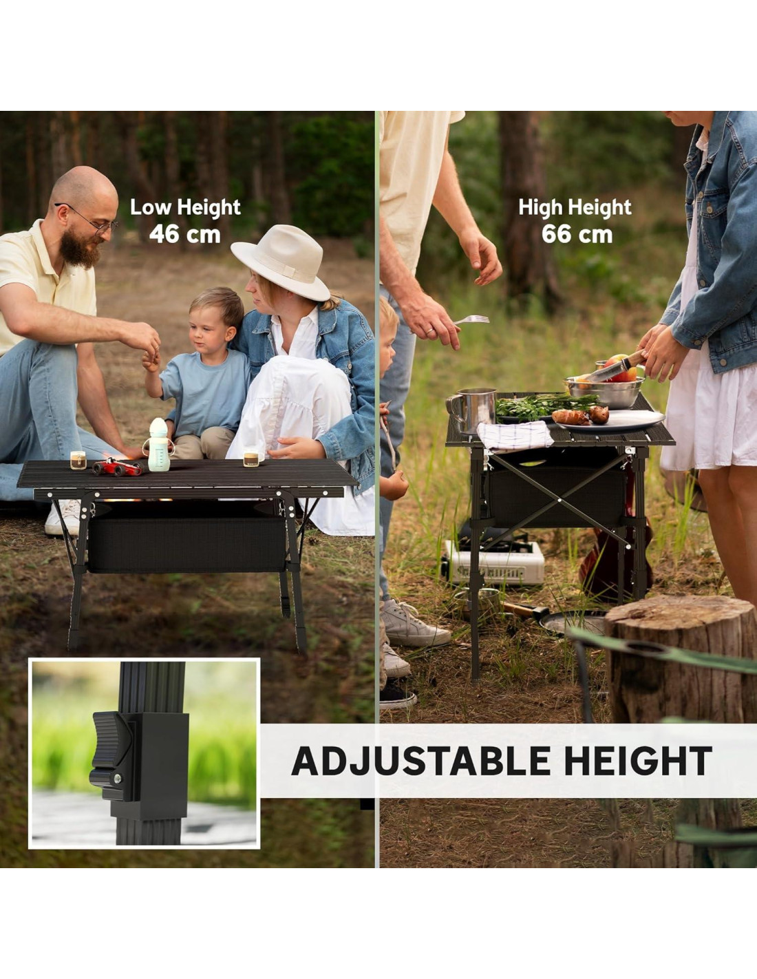 - Altura Ajustable: Esta mesa de playa se puede ajustar de 17.7"-26" (44.9 cm - 66 cm), acomodando diversas necesidades y proporcionando estabilidad en superficies exteriores irregulares, asegurando comodidad en el campamento o mientras haces tailgating.