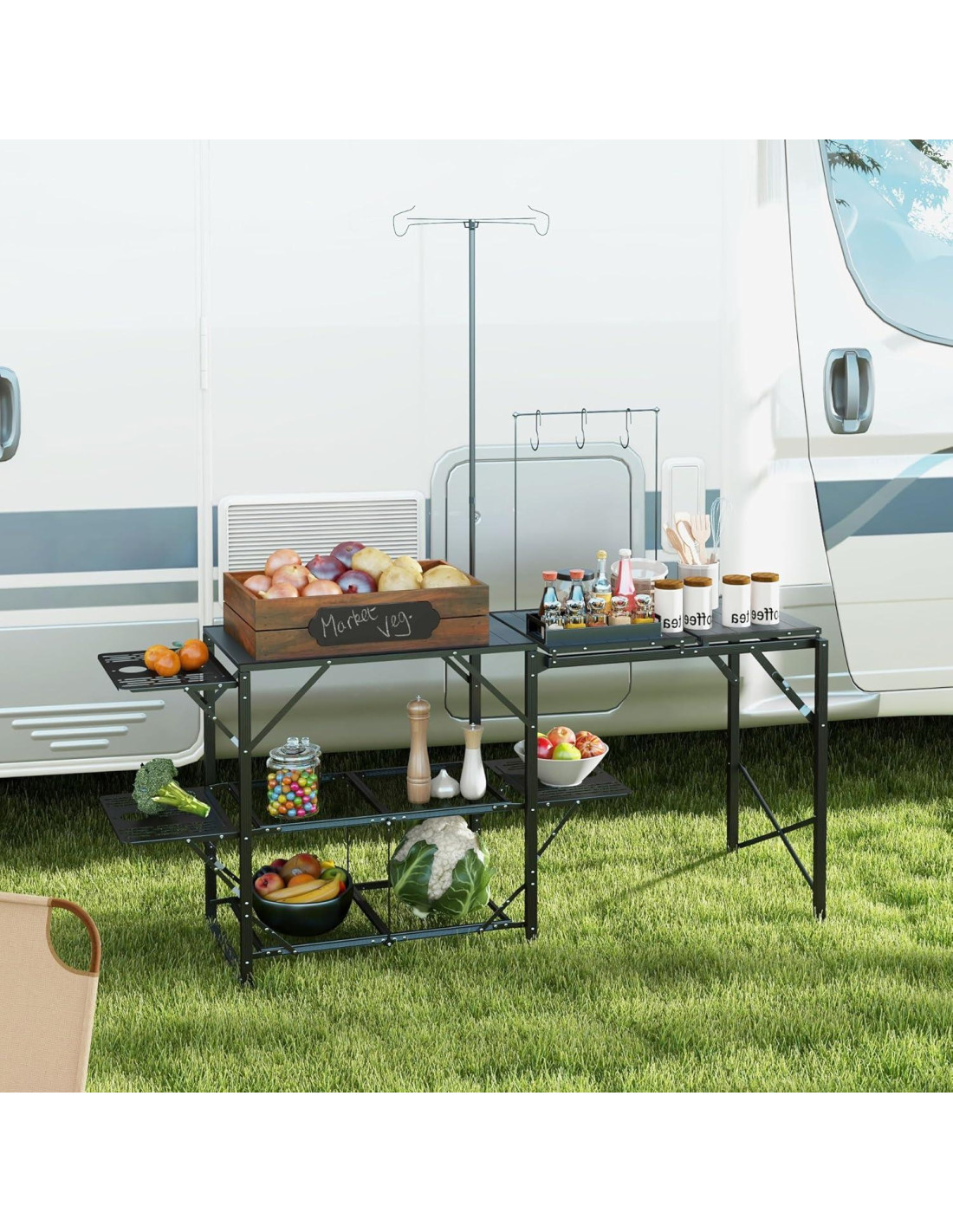 - Accesorios Convenientes: 4 ganchos para colgar utensilios, permitiendo herramientas de cocina de camping organizadas y de fácil acceso.