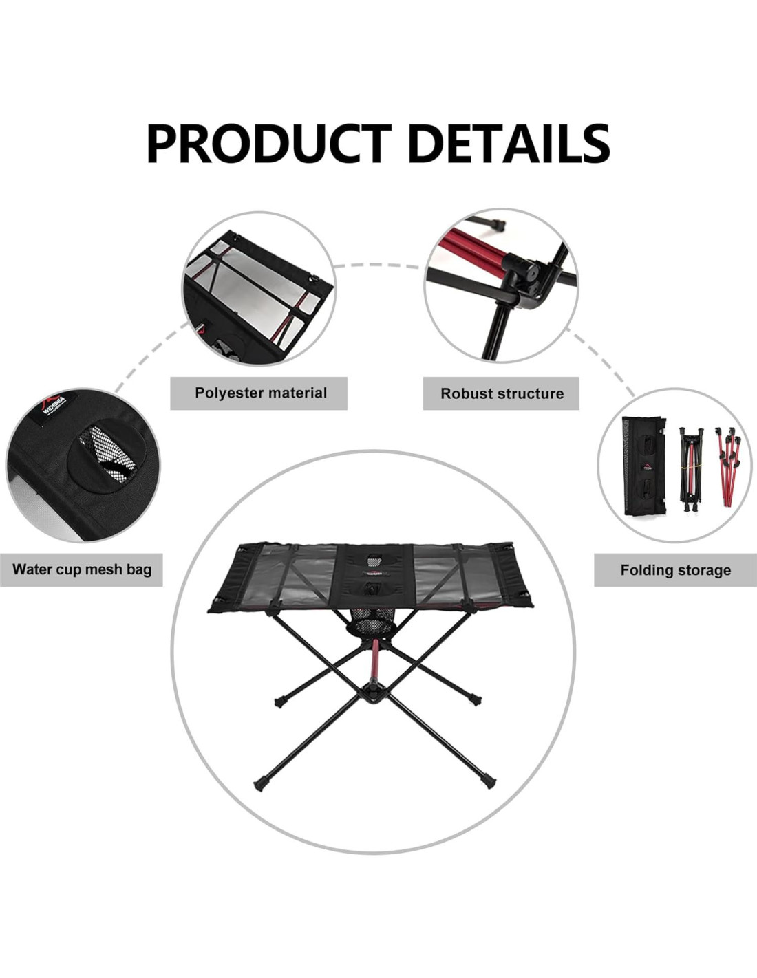 - Diseño portátil: Esta mesa de camping plegable está diseñada para un fácil transporte y almacenamiento, lo que la hace perfecta para aventuras al aire libre.
