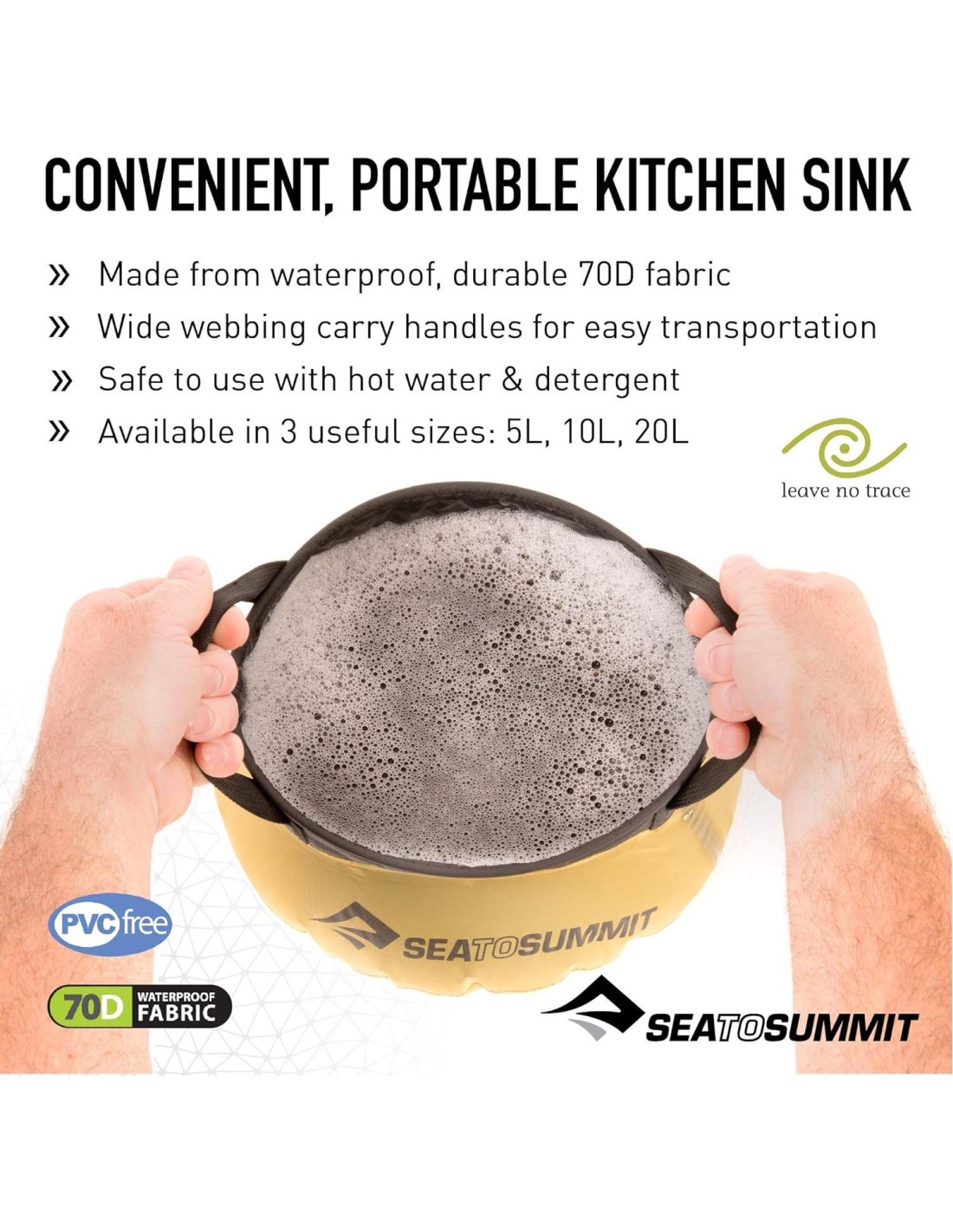 El Fregadero Plegable Sea to Summit es un fregadero plegable de uso múltiple para transportar agua, preparar comidas, lavar platos y mantener la higiene personal al hacer senderismo, acampar, empacar en bicicleta y aventurarse al aire libre. Hecho de nylon impermeable 70D con costuras completamente selladas, es seguro de usar con jabones y detergentes suaves (sin blanqueador) y agua caliente hasta 60 grados Celsius. Se mantiene de pie cuando está lleno, su amplia base y anillo de refuerzo de acero inoxidable evitan que el fregadero se colapse cuando está lleno. El Fregadero Plegable Sea to Summit cuenta con asas de cinta ancha para un fácil transporte e incluye un bolso de almacenamiento con cremallera y un orificio de drenaje. Practica los principios de No Dejar Rastro utilizando al menos 91 metros de fuentes de agua. Disponible en tres tamaños: fregadero de 5 litros (1.3 galones) mide 28 x 23 x 10 centímetros, se pliega a 11.4 x 4.4 centímetros y pesa 99 gramos; fregadero de 10 litros (2.6 galones) mide 38 x 28 x 15 centímetros, se pliega a 14 x 4.4 centímetros y pesa 133 gramos; fregadero de 20 litros (5.2 galones) mide 46 x 36 x 18 centímetros, se pliega a 15.9 x 4.4 centímetros y pesa 187 gramos. Libre de PVC y BPA. Los productos Sea to Summit están garantizados contra defectos en materiales o mano de obra durante la vida útil del producto.