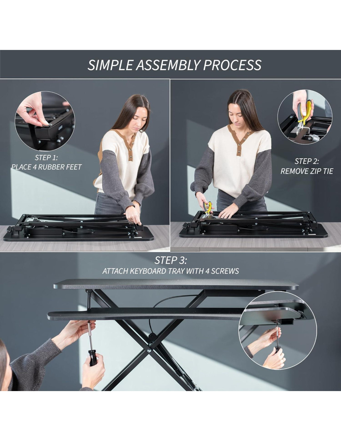 - Montaje Muy Mínimo - Este elevador está casi listo para usar directamente de la caja. Colócalo en tu escritorio existente, adjunta la bandeja de teclado y comienza a organizar tu estación de trabajo.