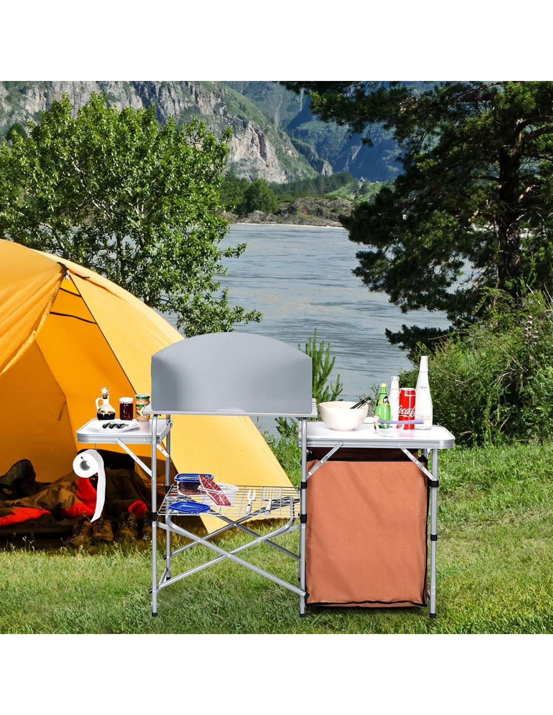 - Estación de Cocina Portátil Esta mesa de camping con diseño plegable te brinda comodidad de uso. Y es fácil para ti abrir, montar y cerrar en menos de un minuto. Perfecta para barbacoas al aire libre, fiestas, camping, picnics, jardines y tailgating.
