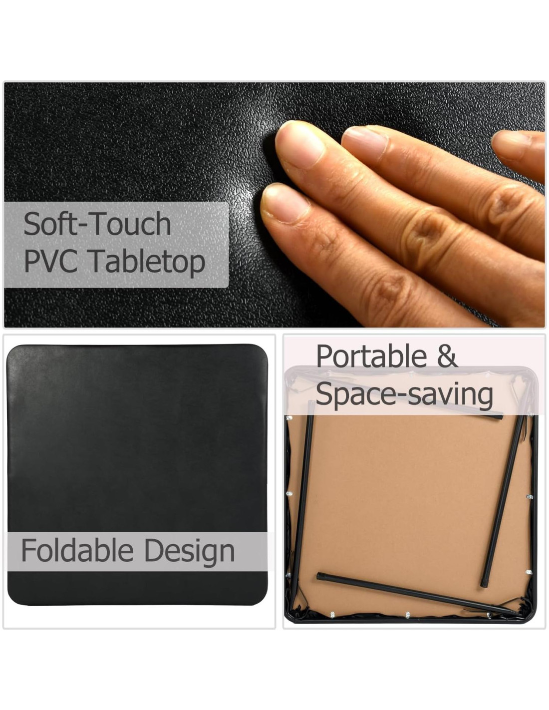 - Construcción Duradera: Fabricada con una fuerte estructura de metal y una superficie de PVC de alta calidad, esta mesa plegable está diseñada para resistir el uso diario. La superficie de PVC es resistente a manchas, rasguños y agua, asegurando que se mantenga como nueva durante años. La robusta estructura de metal proporciona un excelente soporte, ofreciendo fiabilidad para una variedad de usos, desde cenas hasta juegos.