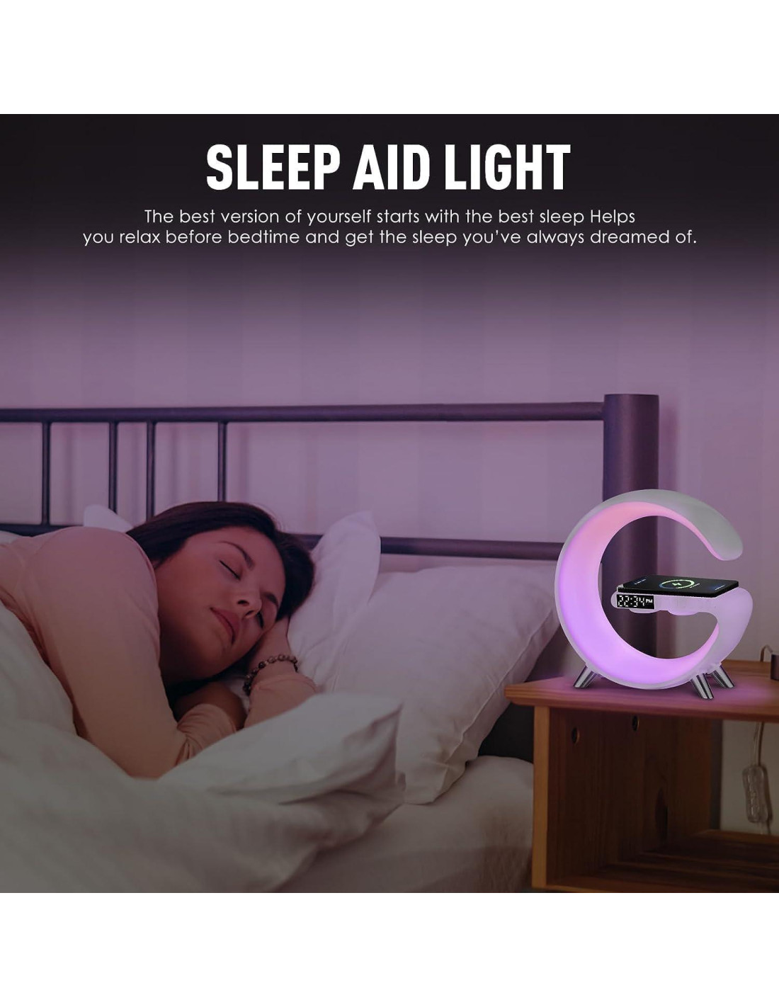 - [Luz de Ambiente Multifuncional Inalámbrica 4 en 1] : Diseño en forma de G recién mejorado. La lámpara no solo es una luz de ambiente, altavoz Bluetooth, luz de música, luz de sueño, luz de ambiente, luz de mesita, efecto de deslumbramiento, audio Bluetooth, reloj, despertador y otras funciones. Puedes usar esta gran luz mientras trabajas, estudias, lees y duermes.