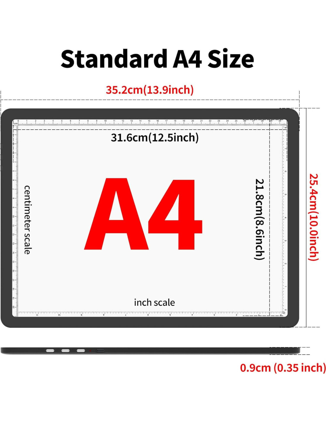- Tamaño estándar A4, doble escala CM-INCH Esta almohadilla de luz súper brillante tiene un tamaño total de 35.2 x25.4 x 0.9 cm (13.9 x 10.0 x 0.35 pulgadas), y el área de trabajo visual es de 31.6 x 21.8 cm (12.5 x 8.6 pulgadas). Área iluminada lo suficientemente grande para papel A4 de estándar internacional. Esta almohadilla de dibujo tiene una doble escala de centímetros y pulgadas para satisfacer tus diversos hábitos de uso.