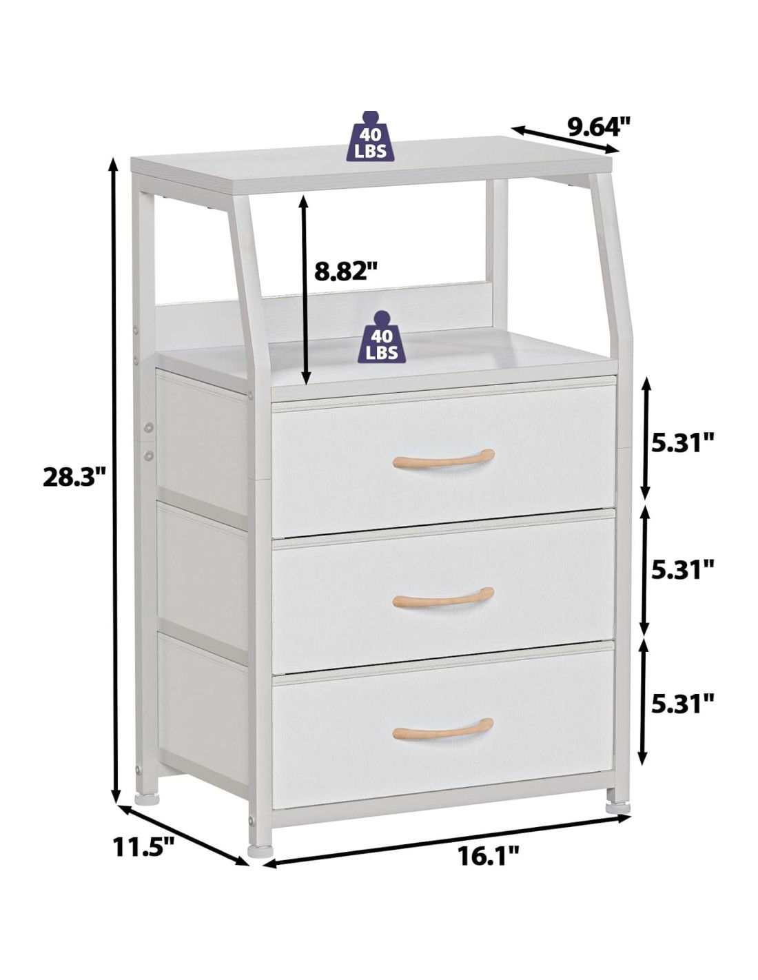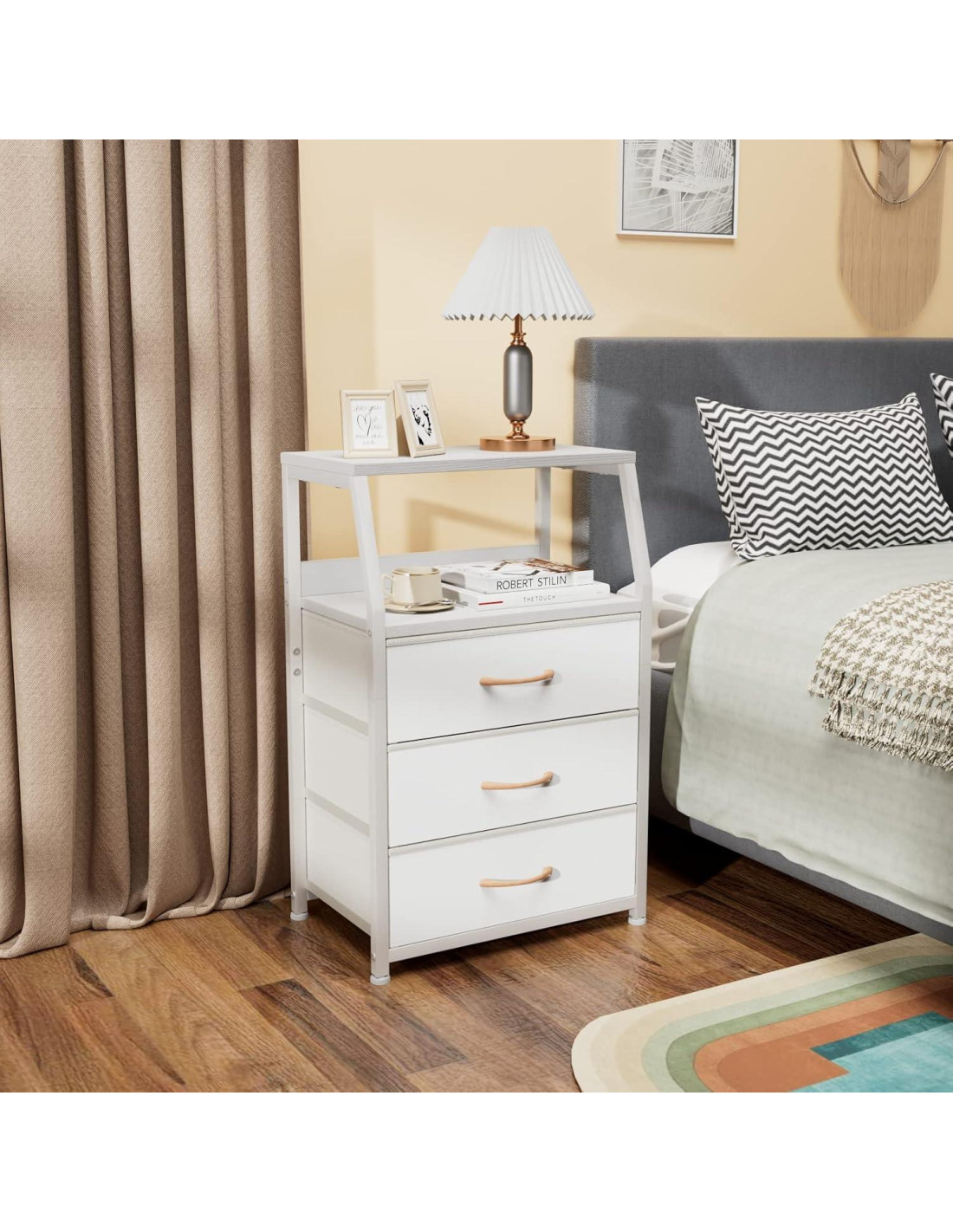 - Estructura Resistente: La mesita de noche está hecha con un marco de metal resistente, que ofrece un soporte de alta resistencia y asegura años de uso. El marco general es estable y pesa solo 5.4 kg, no es voluminoso y es fácil de mover. Se proporciona un dispositivo anti-vuelco para evitar que se caiga. Estabilidad y seguridad garantizadas.