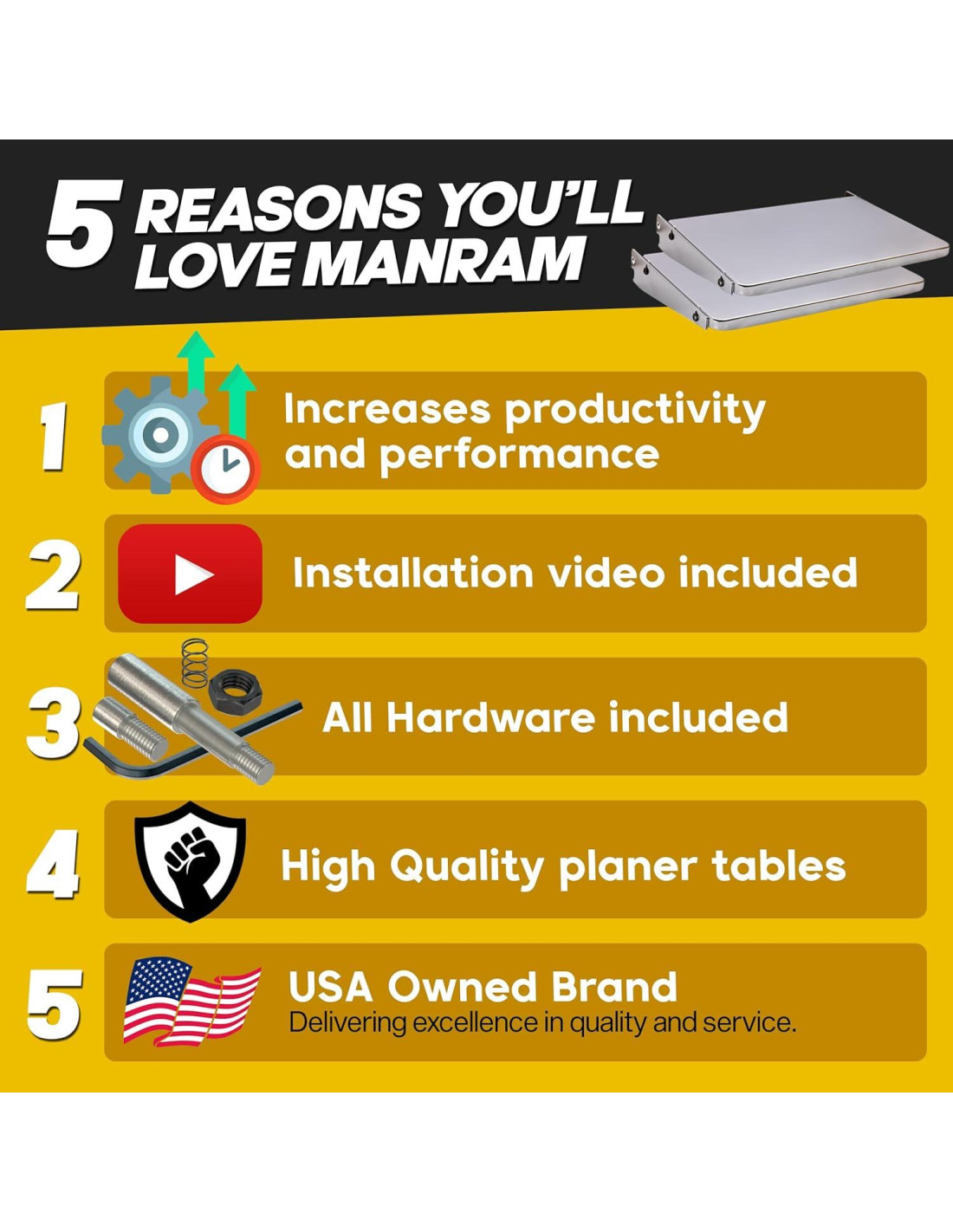 - Mesa Planer Manram - La Mesa Planer Manram proporciona soporte adicional de 9 pulgadas (22,86 cm) en cada lado (total 18 pulgadas (45,72 cm)) para el planer Dewalt DW735. Estas mesas aumentarán tu productividad y rendimiento.