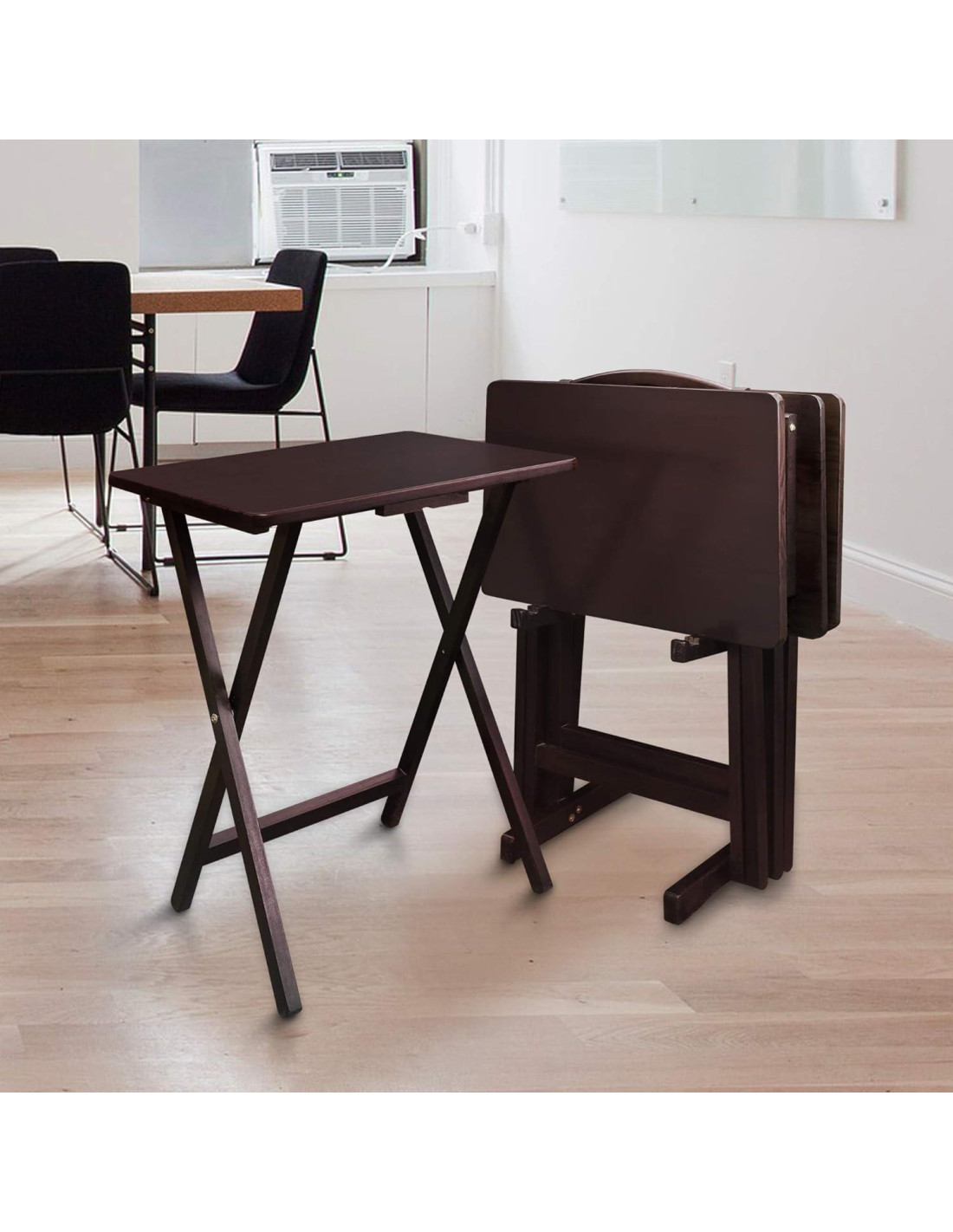 Con este conjunto de mesas plegables de 5 piezas puedes tener una mesa en cualquier lugar de tu hogar. Hecho de madera 100% maciza, este conjunto incluye 4 mesas plegables y un soporte de almacenamiento conveniente, que es ideal para el transporte. Perfecto para comidas frente al televisor o comidas familiares que salen de la cocina o el comedor.