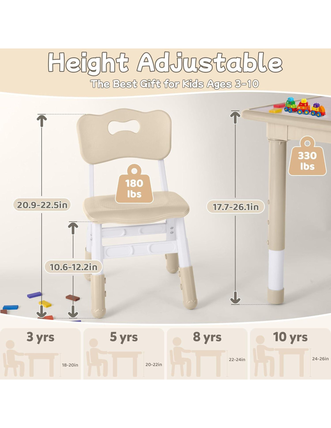 - Altura Ajustable - Mejora: El juego de mesa y sillas para niños ha sido mejorado en términos de altura ajustable. La mesa tiene 8 niveles ajustables entre 17.7" (44.9 cm) y 26.1" (66.3 cm). La silla tiene 3 niveles ajustables entre 20.6" (52.3 cm) y 22" (55.9 cm). La altura del asiento correspondiente de la silla se puede ajustar de 10.6" (26.9 cm) a 12" (30.5 cm). La mejora de altura ajustable puede permitir que la mesa acompañe a los niños por más tiempo y deje recuerdos más hermosos.