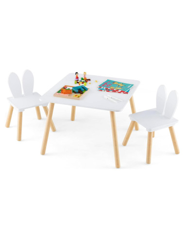 Descripción: Este conjunto de mesa y sillas para niños será una elección perfecta para satisfacer las necesidades diarias de tu pequeño. La mesa de juego con una amplia superficie y 2 lindas sillas con respaldo ofrecen a tus hijos un rincón cómodo para dibujar, leer, jugar o comer. Diseñado con patas de madera resistentes, cada silla soporta hasta 39.9 kg, mientras que la mesa soporta hasta 19.9 kg. Además, los bordes redondeados y las superficies sin astillas hacen que el conjunto de muebles sea seguro de usar. Después de usar, puedes guardar las sillas debajo de la mesa o apilarlas sobre la mesa para ahorrar espacio limitado. Características: Conjunto de mesa y sillas multifuncional para comer, jugar, dibujar o aprender Estructura de madera resistente ayuda a asegurar un largo tiempo de servicio Certificaciones ASTM y CPSIA para mayor seguridad Superficie de mesa amplia y lisa es fácil de limpiar Lindo respaldo con orejas de conejo lo hace más atractivo Silla ergonómica con asiento ancho permite comodidad al sentarse para los niños Altura amigable para niños la hace adecuada para su uso Adecuado para la habitación de los niños, sala de juegos, sala de estar, guardería, aula, etc. Conexión ajustada y patas de madera sólida evitan el tambaleo Conveniente de instalar con instrucciones detalladas Especificaciones: Color: Blanco Material: MDF, Madera de Pino Tamaño de la Mesa: 62.2 cm x 62.2 cm x 43.2 cm (L x W x H) Tamaño de Cada Silla: 33 cm x 30.5 cm x 47 cm (L x W x H) Tamaño de la Superficie de la Mesa: 59.7 cm x 59.7 cm (L x W) Tamaño del Asiento: 25.4 cm x 25.4 cm (L x W) Edad Adecuada: 3-6 Años Capacidad de Peso de la Mesa: 19.9 kg Capacidad de Peso de Cada Silla: 39.9 kg Peso Neto: 8.6 kg Paquete incluye: 1 x Mesa 2 x Sillas 1 x Instrucción